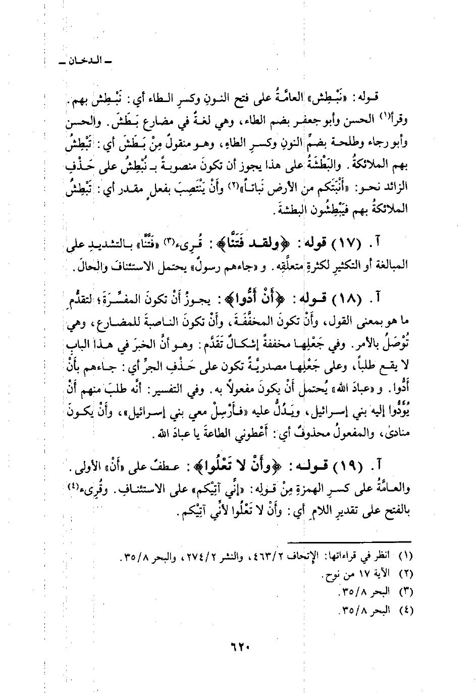 قوله: {وَأَن لاَّ تَعْلُواْ} : عطفٌ على «أَنْ» الأولى. والعامَّةُ على كسرِ الهمزةِ مِنْ قولِه: «إنِّي آتِيْكم» على الاستئنافِ. وقُرِئ بالفتح على تقديرِ اللامِ أي: وأَنْ لا تَعْلُوا لأنِّي آتِيْكم.