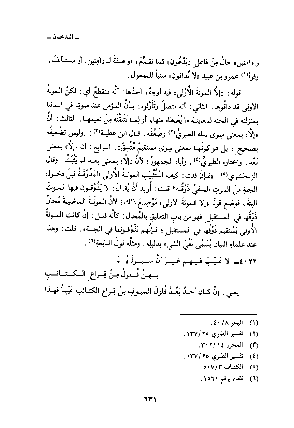 قوله: {إِلاَّ الموتة الأولى} فيه أوجهٌ، أحدُها: أنَّه منقطعٌ أي: لكنْ الموتةُ الأولى قد ذاقُوها. الثاني: أنه متصلٌ وتَأَوَّلوه: بأنَّ المؤمنَ عند موتِه في الدنيا بمنزلته في الجنة لمعاينة ما يُعْطاه منها، أو لِما يَتَيَقَّنُه مِنْ نعيمِها. الثالث: أنَّ «إلاَّ» بمعنى سِوى نقله الطبريُّ وضَعَّفَه. قال ابن عطية: «وليس تَضْعيفُه بصحيحٍ، بل هو كونُها بمعنى سِوى مستقيمٌ مُتَّسِقٌ» . الرابع: أن «إلاَّ» بمعنى بَعْد. واختاره الطبريُّ، وأباه الجمهورُ؛ لأنَّ «إلاَّ» بمعنى بعد لم يَثْبُتْ. وقال الزمخشري: «فإنْ قلت: كيف اسْتُثْنِيَتِ الموتةُ الأُولى المَذُوْقَةُ قبلَ دخول الجنةِ مِنَ الموتِ المنفيِّ ذَوْقُه؟ قلت: أُريدَ أَنْ يُقالَ: لا يَذُوْقون فيها الموتَ البتةَ، فوضع قولَه {إِلاَّ الموتة الأولى} مَوْضِعَ ذلك؛ لأنَّ الموتَةَ الماضيةَ مُحالٌ ذَوْقُها في المستقبل فهو من بابِ التعليقِ بالمُحال: كأنَّه قيل: إنْ كانت الموتةُ الاُولى يَسْتقيم ذَوْقُها في المستقبلِ؛ فإنَّهم يَذْوْقونها في الجنة» . قلت: وهذا عند علماءِ البيانِ يُسَمَّى نَفْيَ الشيء بدليلِه. ومثلُه قول النابغةِ: