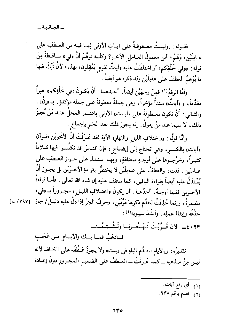 فقوله:» وليسَتْ معطوفةً على آياتِ الأولى لِما فيه من العطفِ على عامِلَيْن «وَهَمٌ؛ أين معمولُ العاملِ الآخر؟ وكأنه توهَّمَ أنَّ» في «ساقطةٌ مِنْ قولِه:» وفي خَلْقِكم «أو اختلطَتْ عليه {آيَاتٌ لِّقَوْمٍ يَعْقِلُونَ} بهذه؛ لأنَّ تَيْكَ فيها ما يُوْهِمُ العطفَ على عامِلَيْن وقد ذكره هو أيضاً.