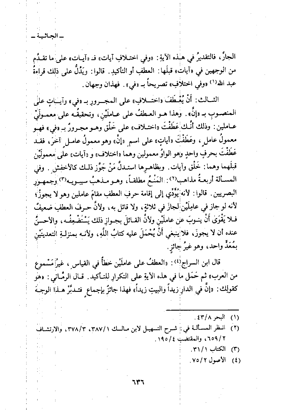 الثالث: أَنْ يُعْطَفَ «اختلافِ» على المجرورِ ب «في» وآياتٍ على المنصوبِ ب «إنَّ» . وهذا هو العطفُ على عاملَيْنِ، وتحقيقُه على معمولَيْ عاملين: وذلك أنَّك عَطَفْتَ «اختلاف» على خَلْق وهو مجرورٌ ب «في» فهو معمولُ عاملٍ، وعَطَفْتَ «آياتٍ» على اسمِ «إنَّ» وهو معمولُ عاملٍ آخرَ، فقد عَطَفْتَ بحرفٍ واحدٍ وهو الواوُ معمولين وهما «اختلاف» و «آيات» على معمولَيْن قبلَهما وهما: خَلْق وآيات. وبظاهرِها استدلَّ مَنْ جَوَّز ذلك كالأخفشِ. وفي المسألة أربعةُ مذاهب: المَنْعُ مطلقاً، وهو مذهبُ سيبويه وجمهورِ البصريين. قالوا: لأنه يُؤَدِّي إلى إقامة حرفِ العطفِ مقامَ عاملين وهو لا يجوزُ؛ لأنه لو جاز في عامِلَيْن لجازَ في ثلاثةٍ، ولا قائل به، ولأنَّ حرفَ العطفِ ضعيفٌ فلا يَقْوَى أَنْ ينوبَ عن عاملَيْنِ ولأنَّ القائلَ بجوازِ ذلك يَسْتَضْعِفُه، والأحسنُ عنده أن لا يجوزَ، فلا ينبغي أَنْ يُحْمَلَ عليه كتابُ اللَّهِ، ولأنه بمنزلةِ التعديتَيْنِ بمُعَدٍّ واحد، وهو غيرُ جائزٍ.