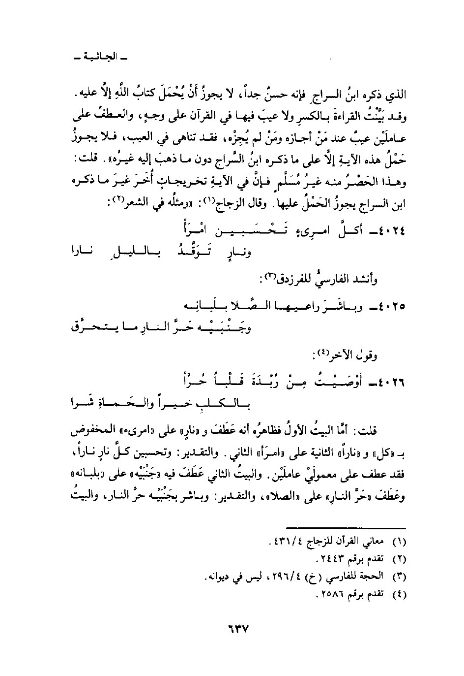 قلت: وهذا الحَصْرُ منه غيرُ مُسَلَّمٍ فإنَّ في الآيةِ تخريجاتٍ أُخَرَ غيرَ ما ذكره ابن السراج يجوزُ الحَمْلُ عليها. وقال الزجاج: «ومثلُه في الشعر: