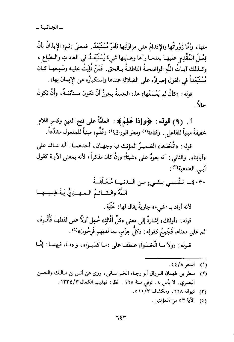 منها، وأمَّا زَوْراتُها والإِقدامُ على مزاوَلَتِها فأمرٌ مُسْتَبْعَدٌ. فمعنى» ثم «الإِيذانُ بأنَّ فِعْلَ المُقْدِمِ عليها بعدما رآها وعاينها شيءٌ يُسْتَبْعَدُ في العاداتِ والطباعِ، وكذلك آياتُ اللَّهِ الواضحةُ الناطقةُ بالحق. فَمَنْ تُلِيَتْ عليه وسَمِعها كان مُسْتَبْعَداً في القول إصرارُه على الضلالةِ عندها واستكبارُه عن الإِيمان بها» .