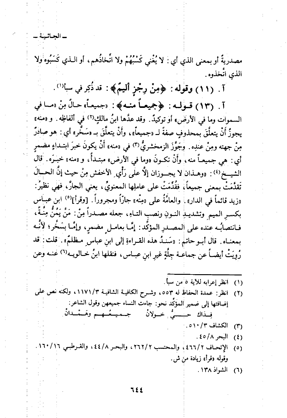 قوله: {جَمِيعاً مِّنْهُ} : «جميعاً» حالٌ مِنْ {مَّا فِي السماوات وَمَا فِي الأرض} أو توكيدٌ. وقد عدَّها ابنُ مالكٍ في ألفاظِه. و «منه» يجوزُ أَنْ يتعلَّقَ بمحذوفٍ صفةً ل «جميعاً» ، وأَنْ يتعلَّقَ ب «سَخَّر» أي: هو صادرٌ مِنْ جهته ومِنْ عندِه. وجَوَّزَ الزمخشريُّ في «منه» أَنْ يكونَ خبرَ ابتداءٍ مضمرٍ أي: هي جميعاً منه، وأَنْ تكونَ {وَمَا فِي الأرض} مبتدأً، و «منه» خبرَه. قال الشيخ: «وهذان لا يجوزان إلاَّ على رَأْيِ الأخفش مِنْ حيث إنَّ الحالَ تَقدَّمَتْ بمعنى جميعاً، فقُدِّمَتْ على عاملِها المعنويِّ، يعني الجارَّ، فهي نظيرُ:» زيد قائماً في الدار «. والعامَّةُ على» مِنْه «جارّاً ومجروراً. [وقرأ] ابن عباس بكسرِ الميمِ وتشديدِ النونِ ونصبِ التاءِ، جعله مصدراً مِنْ: مَنَّ يَمُنَّ مِنَّةً، فانتصابُه عنده على المصدرِ المؤكِّد: إمَّا بعاملٍ مضمرٍ، وإمَّا بسَخَّر؛ لأنَّه بمعناه. قال أبو حاتم:» سَندُ هذه القراءةِ إلى ابنِ عباسِ مظلمٌ «. قلت: قد رُوِيَتْ أيضاً عن جماعة جِلَّةٍ غيرِ ابنِ عباس، فنقلها ابنُ خالويه عنه وعن