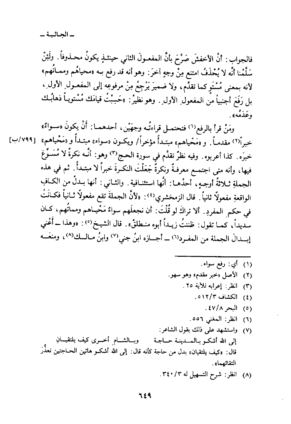 ومَنْ قرأ بالرفع فتحتمل قراءتُه وجهَيْن، أحدهما: أَنْ يكونَ «سواءٌ» خبراً مقدماً. و «مَحْياهم» مبتدأً مؤخراً/ ويكون «سواء» مبتدأً و «مَحْياهم» خبرَه.