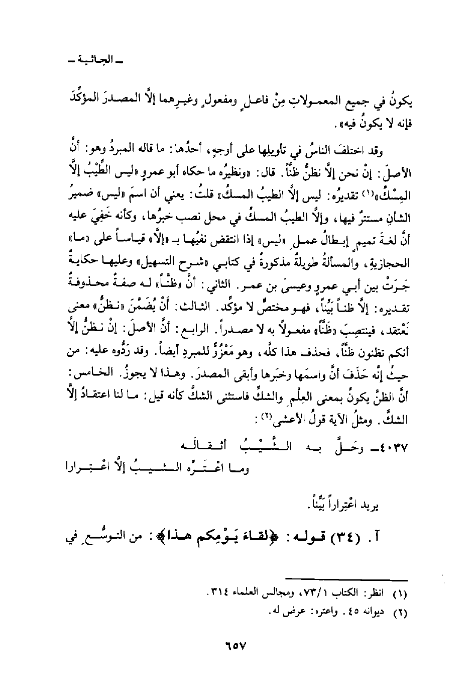 وقد اختلفَ الناسُ في تأويلِها على أوجهٍ، أحدُها: ما قاله المبردُ وهو: أنَّ الأصلَ: إنْ نحن إلاَّ نظنُّ ظنَّاً. قال:» ونظيرُه ما حكاه أبو عمروٍ «ليس الطِّيْبُ إلاَّ المِسْكُ» تقديرُه: ليس إلاَّ الطيبُ المسكُ «قلتُ: يعني أن اسمَ» ليس «ضميرُ الشأنِ مستترٌ فيها، وإلاَّ الطيبُ المسكُ في محل نصب خبرُها، وكأنه خَفِيَ عليه أنَّ لغةَ تميمٍ إبطالُ عملِ» ليس «إذا انتقض نفيُها ب» إلاَّ «قياساً على» ما «الحجازيةِ، والمسألةُ طويلةٌ مذكورةٌ في كتابي» شرح التسهيل «وعليها حكايةٌ جَرَتْ بين أبي عمروٍ وعيسى بن عمر. الثاني: أنَّ» ظنَّاً «له صفةٌ محذوفةٌ تقديره: إلاَّ ظناً بَيِّناً، فهو مختصٌّ لا مؤكِّد. الثالث: أَنْ يُضَمَّنَ» نظنُّ «معنى نَعْتقد، فينتصِبَ» ظَنَّاً «مفعولاً به لا مصدراً. الرابع: أنَّ الأصلَ: إنْ نظنُّ إلاَّ أنكم تظنون ظنَّاً، فحذف هذا كلَّه، وهو مَعْزُوٌّ للمبردِ أيضاً. وقد رَدُّوه عليه: من حيثُ إنَّه حَذَفَ أنَّ واسمَها وخبرَها وأبقى المصدرَ. وهذا لا يجوزُ. الخامس: أنَّ الظنَّ يكونُ بمعنى العِلْمِ والشكِّ فاستثنى الشكَّ كأنه قيل: ما لنا اعتقادٌ إلاَّ الشكَّ. ومثلُ الآية قولُ الأعشى: