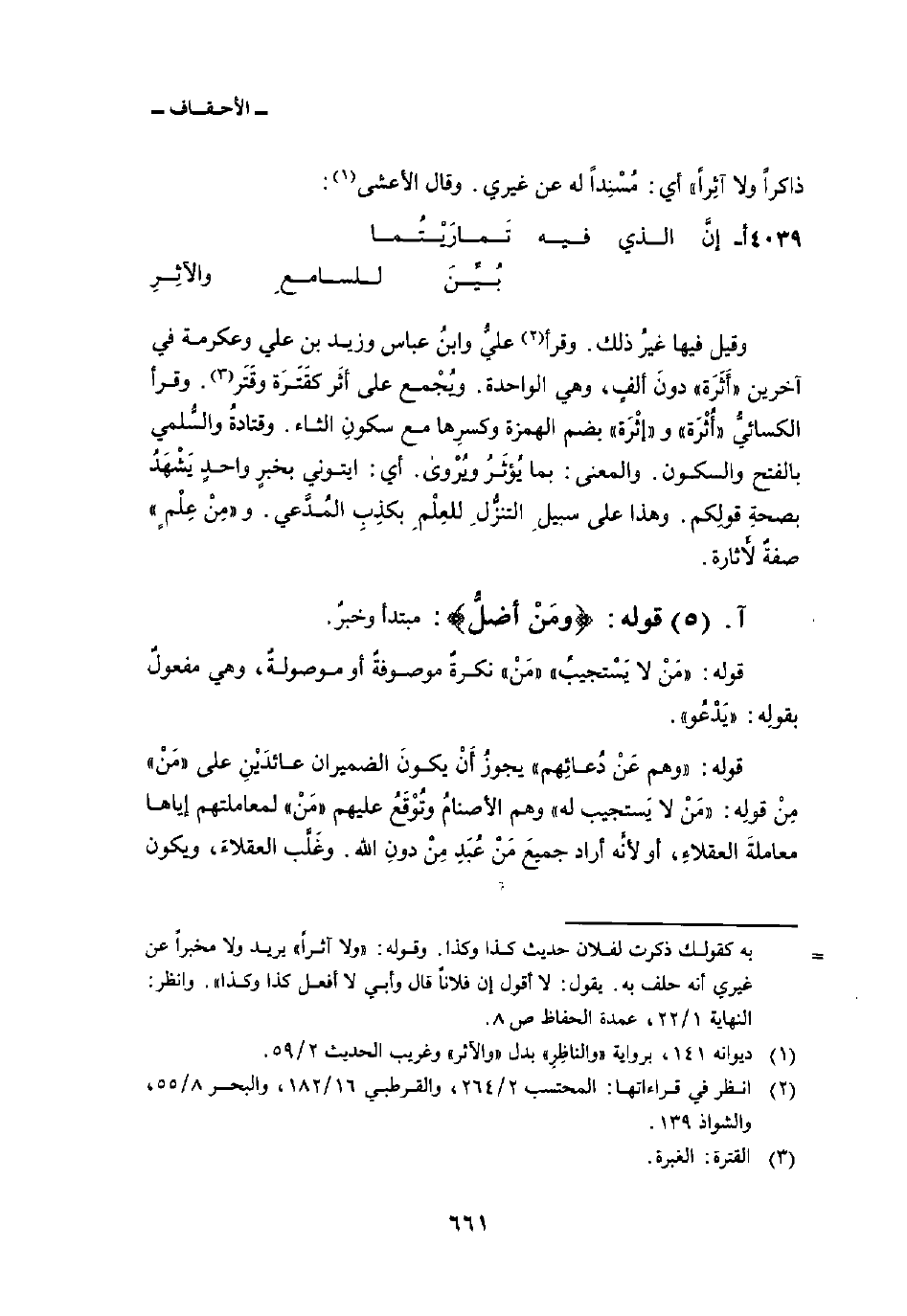 وقيل فيها غيرُ ذلك. وقرأ عليُّ وابنُ عباس وزيد بن علي وعكرمة في آخرين «أَثَرَة» دونَ ألفٍ، وهي الواحدة. ويُجْمع على أثَر كقَتَرَة وقَتَر. وقرأ الكسائيُّ «أُثْرَة» و «إثْرَة» بضم الهمزة وكسرِها مع سكونِ الثاء. وقتادةُ والسُّلمي بالفتح والسكون. والمعنى: بما يُؤثَرُ ويُرْوى. أي: ايتوني بخبرٍ واحدٍ يَشْهَدُ بصحةِ قولِكم. وهذا على سبيلِ التنزُّلِ للعِلْمِ بكذِبِ المُدَّعي. و «مِنْ عِلْمٍ» صفةٌ لأَثارة.