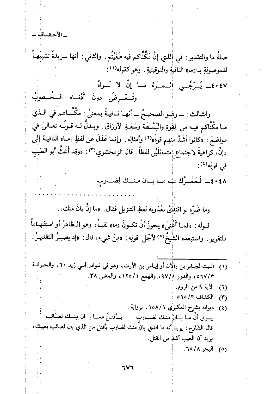 والثالث: - وهو الصحيحُ - أنها نافيةٌ بمعنى: مَكَّنَّاهم في الذي ما مكَّنَّاكم فيه من القوةِ والبَسْطَةِ وسَعَةِ الأرزاق. ويدلُّ له قولُه تعالى في مواضعَ: {كانوا أَشَدَّ مِنْهُمْ قُوَّةً} [الروم: 9] وأمثالِه. وإنما عَدَلَ عن لفظِ «ما» النافية إلى «إنْ» كراهيةً لاجتماعِ متماثلَيْن لفظاً. قال الزمخشري: «وقد أَغَثَّ أبو الطيبِ في قولِه: