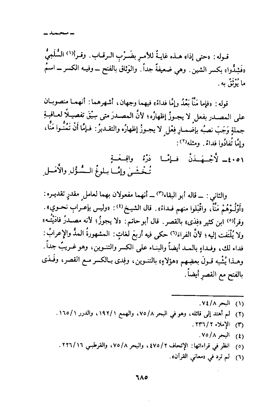 والثاني: - قاله أبو البقاء - أنهما مفعولان بهما لعاملٍ مقدرٍ تقديره: «أَوْلُوْهُمْ مَنَّاً، واقْبَلوا منهم فداءً» . قال الشيخ: «وليس بإعرابِ نحوي» . وقرأ ابن كثير «فِدَى» بالقصر. قال أبو حاتم: «لا يجوزُ؛ لأنه مصدرُ فادَيْتُه» ولا يُلْتَفت إليه؛ لأنَّ الفراءَ حكى فيه أربعَ لغاتٍ: المشهورةُ المدُّ والإِعرابُ: فداء لك، وفداءٍ بالمد أيضاً والبناء على الكسر والتنوين، وهو غريبٌ جداً. وهذا يُشْبه قولَ بعضِهم «هؤلاءٍ» بالتنوين، وفِدى بالكسر مع القصر، وفَدَى بالفتح مع القصرِ أيضاً.