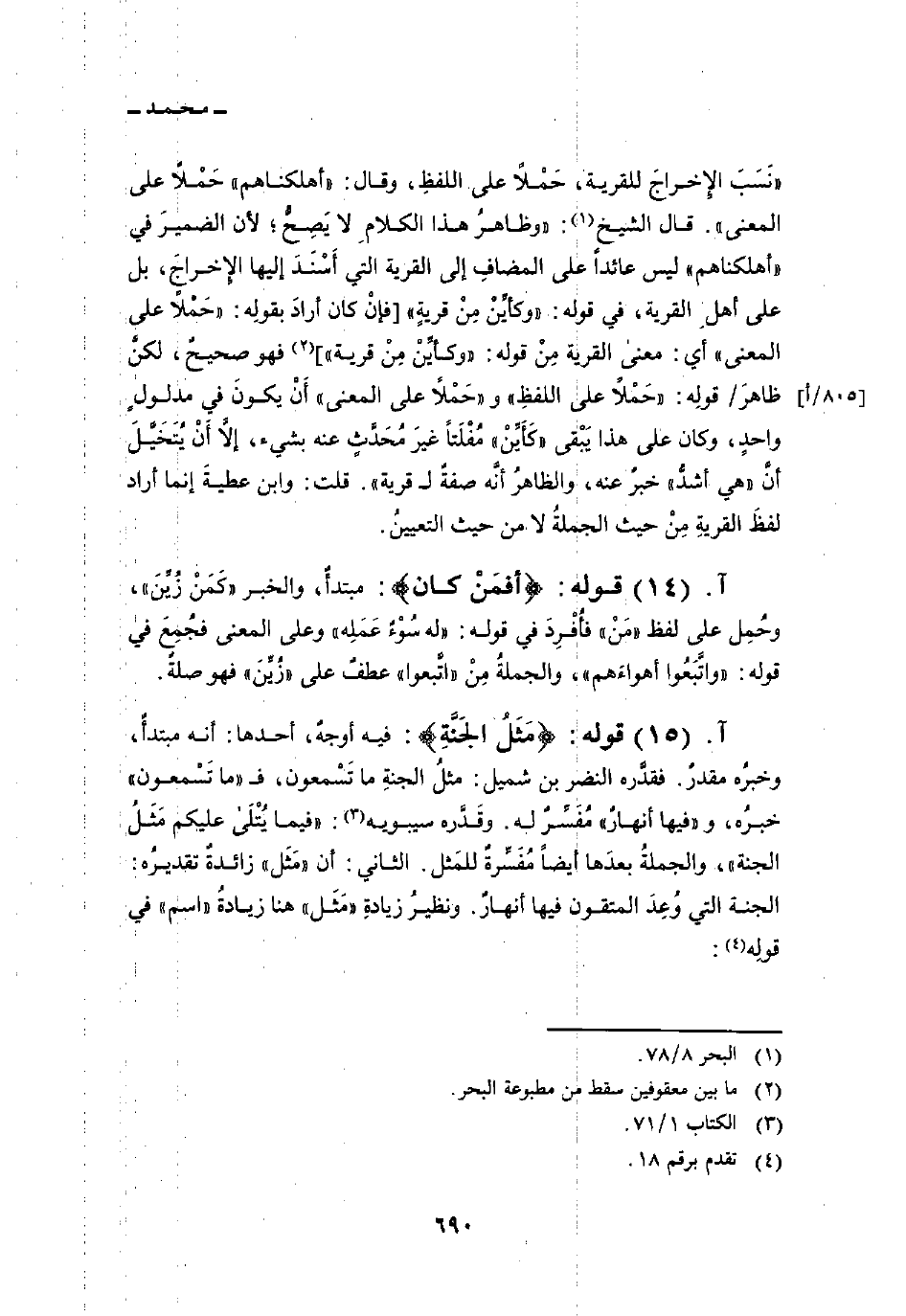 نَسَبَ الإِخراجَ للقرية، حَمْلاً على اللفظِ، وقال:» أهلكناهم «حَمْلاً على المعنى» . قال الشيخ: «وظاهرُ هذا الكلامِ لا يَصِحُّ؛ لأن الضميرَ في» أهلكناهم «ليس عائداً على المضافِ إلى القرية التي أَسْنَدَ إليها الإِخراجَ، بل على أهلِ القرية، في قوله: {وَكَأَيِّن مِّن قَرْيَةٍ} [فإنْ كان أرادَ بقولِه:» حَمْلاً على المعنى «أي: معنى القرية مِنْ قوله: {وَكَأَيِّن مِّن قَرْيَةٍ} ] فهو صحيحٌ، لكنَّ ظاهرَ/ قولِه:» حَمْلاً على اللفظِ «و» حَمْلاً على المعنى «أَنْ يكونَ في مدلولٍ واحدٍ، وكان على هذا يَبْقى» كَأَيِّنْ «مُفْلَتاً غيرَ مُحَدَّثٍ عنه بشيء، إلاَّ أَنْ يُتَخَيَّلَ أنَّ» هي أشدُّ «خبرٌ عنه، والظاهرُ أنَّه صفةٌ ل قرية» . قلت: وابن عطيةَ إنما أراد لفظَ القريةِ مِنْ حيث الجملةُ لا من حيث التعيينُ.