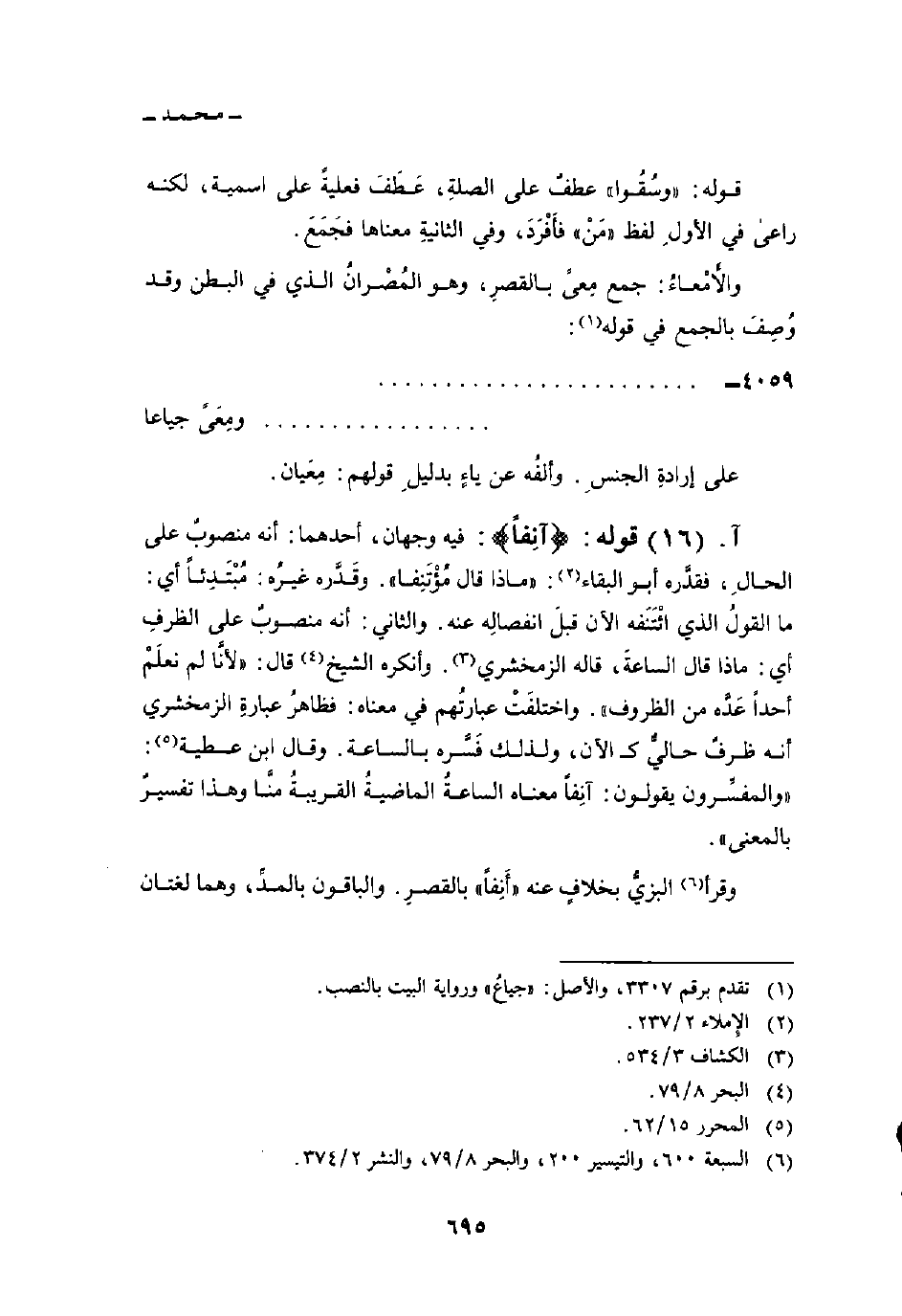قوله: {آنِفاً} : فيه وجهان، أحدهما: أنه منصوبٌ على الحالِ، فقدَّره أبو البقاء: «ماذا قال مُؤْتَنِفا» . وقَدَّره غيرُه: مُبْتَدِئاً أي: ما القولُ الذي ائْتَنَفه الآن قبلَ انفصالِه عنه. والثاني: أنه منصوبٌ على الظرفِ أي: ماذا قال الساعةَ، قاله الزمخشري. وأنكره الشيخ قال: «لأنَّا لم نعلَمْ أحداً عَدَّه من الظروف» . واختلفَتْ عبارتُهم في معناه: فظاهرُ عبارةِ الزمخشري أنه ظرفٌ حاليٌّ ك الآن، ولذلك فَسَّره بالساعة. وقال ابن عطية: «والمفسِّرون يقولون: آنِفاً معناه الساعةُ الماضيةُ القريبةُ منَّا وهذا تفسيرٌ بالمعنى» .