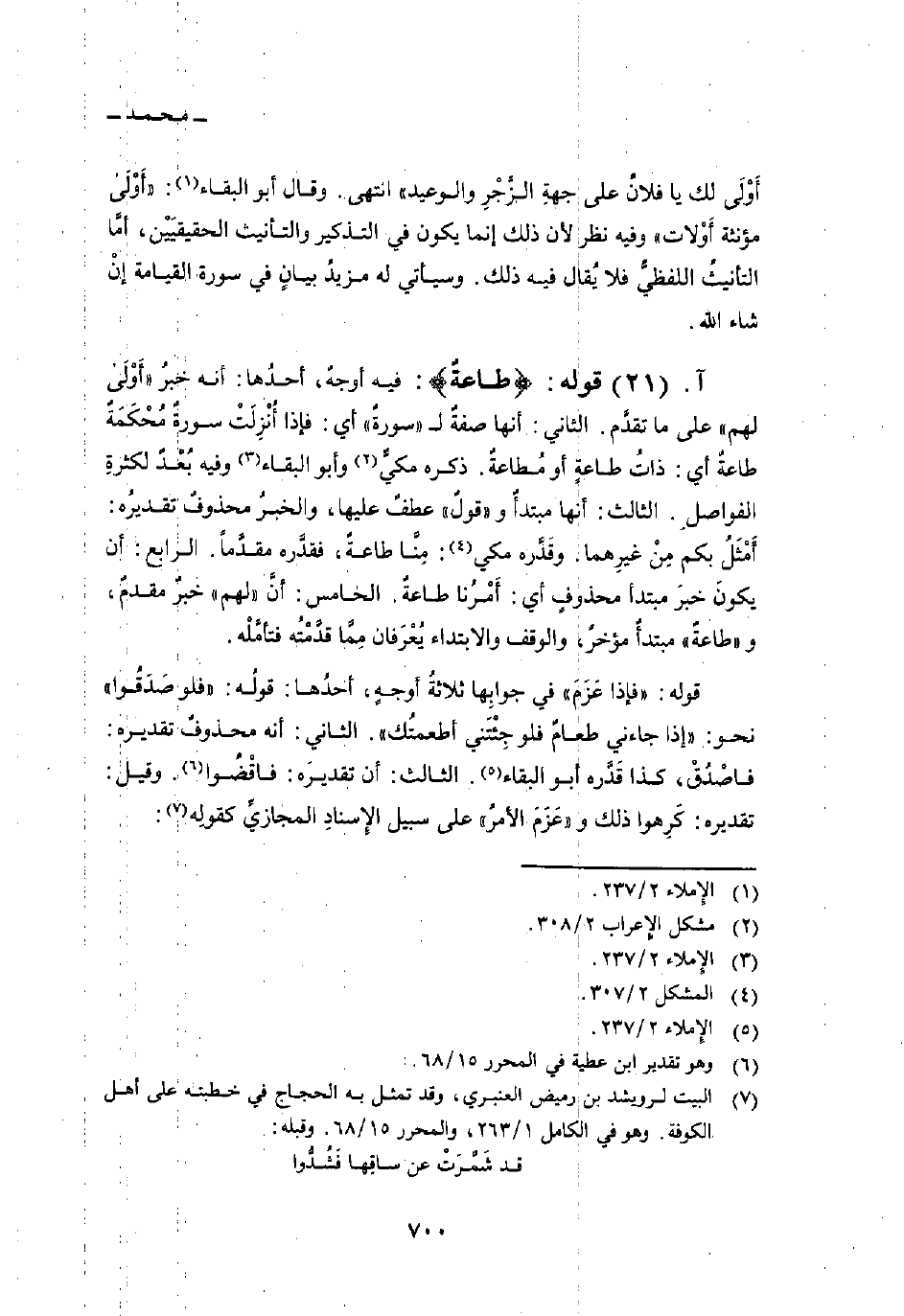 قوله: {طَاعَةٌ} : فيه أوجهٌ، أحدُها: أنه خبرُ «أَوْلَى لهم» على ما تقدَّم. الثاني: أنها صفةٌ ل «سورةٌ» أي: فإذا أُنْزِلَتْ سورةٌ مُحْكَمَةٌ طاعةٌ أي: ذاتُ طاعةٍ أو مُطاعةٌ. ذكره مكيٌّ وأبو البقاء وفيه بُعْدٌ لكثرةِ الفواصلِ. الثالث: أنها مبتدأٌ و «قولٌ» عطفٌ عليها، والخبرُ محذوفٌ تقديرُه: أَمْثَلُ بكم مِنْ غيرِهما. وقَدَّره مكي: مِنَّا طاعةٌ، فقدَّره مقدَّماً. الرابع: أن يكونَ خبرَ مبتدأ محذوفٍ أي: أَمْرُنا طاعةٌ. الخامس: أنَّ «لهم» خبرٌ مقدمٌ، و «طاعةٌ» مبتدأٌ مؤخرٌ، والوقف والابتداء يُعْرَفان مِمَّا قدَّمْتُه فتأمَّلْه.