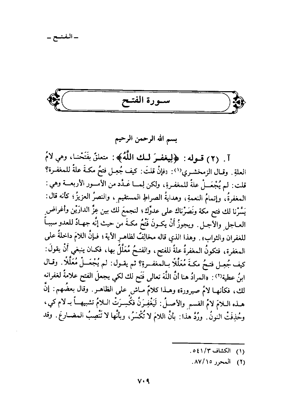 قوله: {لِّيَغْفِرَ لَكَ الله} : متعلقٌ بفَتَحْنا، وهي لامُ العلةِ. وقال الزمخشري: «فإنْ قلتَ: كيف جُعِل فتحُ مكةَ علةً للمغفرة؟ قلت: لم يُجْعَلْ علةً للمغفرةِ، ولكن لِما عَدَّد من الأمور الأربعة وهي: المغفرةُ، وإتمامُ النعمةِ، وهدايةُ الصراطِ المستقيمِ، والنصرُ العزيزُ؛ كأنه قال: يَسَّرْنا لك فتح مكة ونَصَرْناك على عدوِّك؛ لنجمعَ لك بين عِزِّ الدارَيْن وأغراضِ العاجلِ والآجل. ويجوزُ أَنْ يكونَ فَتْحُ مكةَ من حيث إنَّه جهادٌ للعدو سبباً للغفران والثواب» . وهذا الذي قاله مخالِفٌ لظاهرِ الآية؛ فإنَّ اللامَ داخلةٌ على المغفرة، فتكونُ المغفرةُ علةً للفتح، والفتحُ مُعَلَّلٌ بها، فكان ينبغي أَنْ يقولَ: كيف جُعِل فتحُ مكةَ مُعَلَّلاً بالمغفرةِ؟ ثم يقول: لم يُجْعَلْ مُعَلَّلاً. وقال ابنُ عطية: «المرادُ هنا أنَّ اللَّهَ تعالى فَتَح لك لكي يجعلَ الفتح علامةً لغفرانه لك، فكأنها لامُ صيرورة» وهذا كلامٌ ماشٍ على الظاهر. وقال بعضُهم: إنَّ هذه اللامُ لامُ القسمِ والأصلُ: لَيَغْفِرَنَّ فكُسِرَتْ اللامُ تشبيهاً ب لام كي، وحُذِفَتْ النونُ. ورُدَّ هذا: بأنَّ اللامَ لا تُكْسَرُ. وبأنَّها لا تَنْصِبُ المضارعَ. وقد
