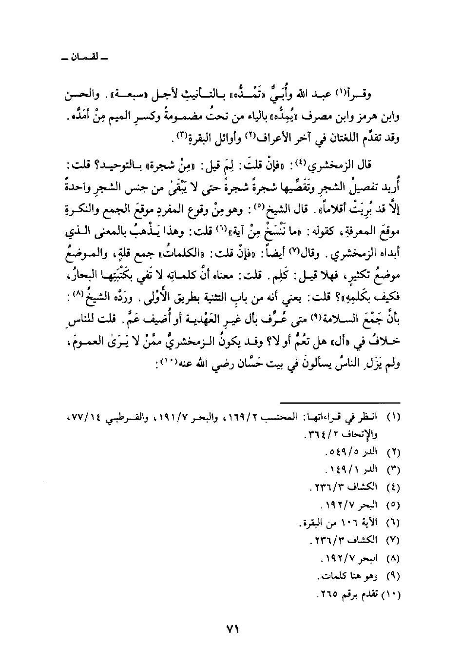 قال الزمخشري: «فإنْ قلتَ: لِمَ قيل:» مِنْ شجرة «بالتوحيد؟ قلت: أُريد تفصيلُ الشجرِ وتَقَصِّيها شجرةً شجرةً حتى لا يَبْقَى من جنس الشجرِ واحدةٌ إلاَّ قد بُرِيَتْ أقلاماً» . قال الشيخ: وهو مِنْ وقوع المفردِ موقعَ الجمع والنكرةِ موقعَ المعرفةِ، كقوله: {مَا نَنسَخْ مِنْ آيَةٍ} [البقرة: 106] قلت: وهذا يَذْهبُ بالمعنى الذي أبداه الزمخشري. وقال أيضاً: «فإنْ قلت:» الكلماتُ «جمع قلةٍ، والموضعُ موضعُ تكثيرٍ، فهلا قيل: كَلِم. قلت: معناه أنَّ كلماتِه لا تَفي بكَتْبَتِها البحارُ، فكيف بكَلمِهِ» ؟ قلت: يعني أنه من بابِ التثنية بطريق الأَوْلى. ورَدَّه الشيخُ: بأنَّ جَمْعَ السلامة متى عُرِّف بأل غيرِ العَهْدية أو أُضيف عَمَّ. قلت للناسِ خلافٌ في «أل» هل تعُمُّ أو لا؟ وقد يكونُ الزمخشريُّ ممَّنْ لا يَرَى العمومَ، ولم يَزَلِ الناسُ يسألونَ في بيت حَسَّان رضي الله عنه: