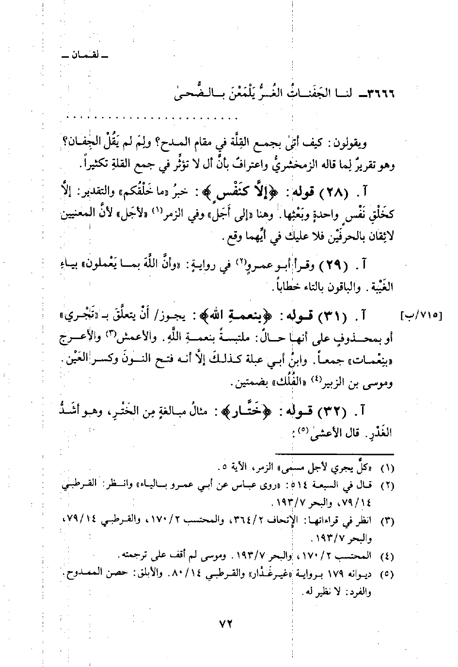ويقولون: كيف أتى بجمع القِلَّة في مقام المدح؟ ولِمَ لم يَقُلْ الجِفان؟ وهو تقريرٌ لِما قاله الزمخشريُّ واعترافٌ بأنَّ أل لا تؤثِّر في جمع القلةِ تكثيراً.