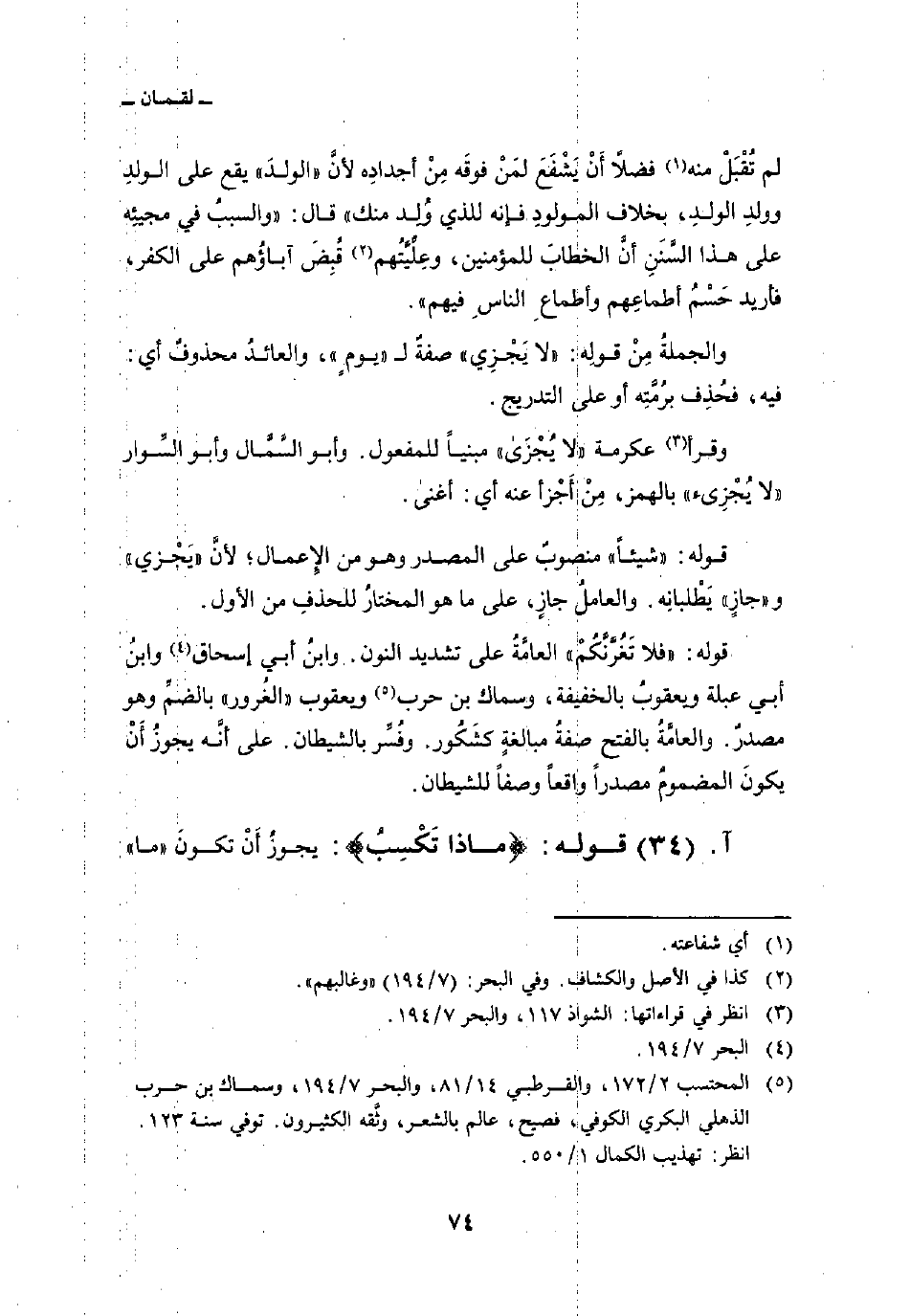 قوله:» فلا تَغُرَّنَّكُمْ «العامَّةُ على تشديد النون. وابنُ أبي إسحاق وابنُ أبي عبلة ويعقوبُ بالخفيفة، وسماك بن حرب ويعقوب» الغُرور «بالضمِّ وهو مصدرٌ، والعامَّةُ بالفتح صفةُ مبالغةٍ كشَكُور. وفُسِّر بالشيطان. على أنَّه يجوزُ أَنْ يكونَ المضمومَ مصدراً واقعاً وصفاً للشيطان.