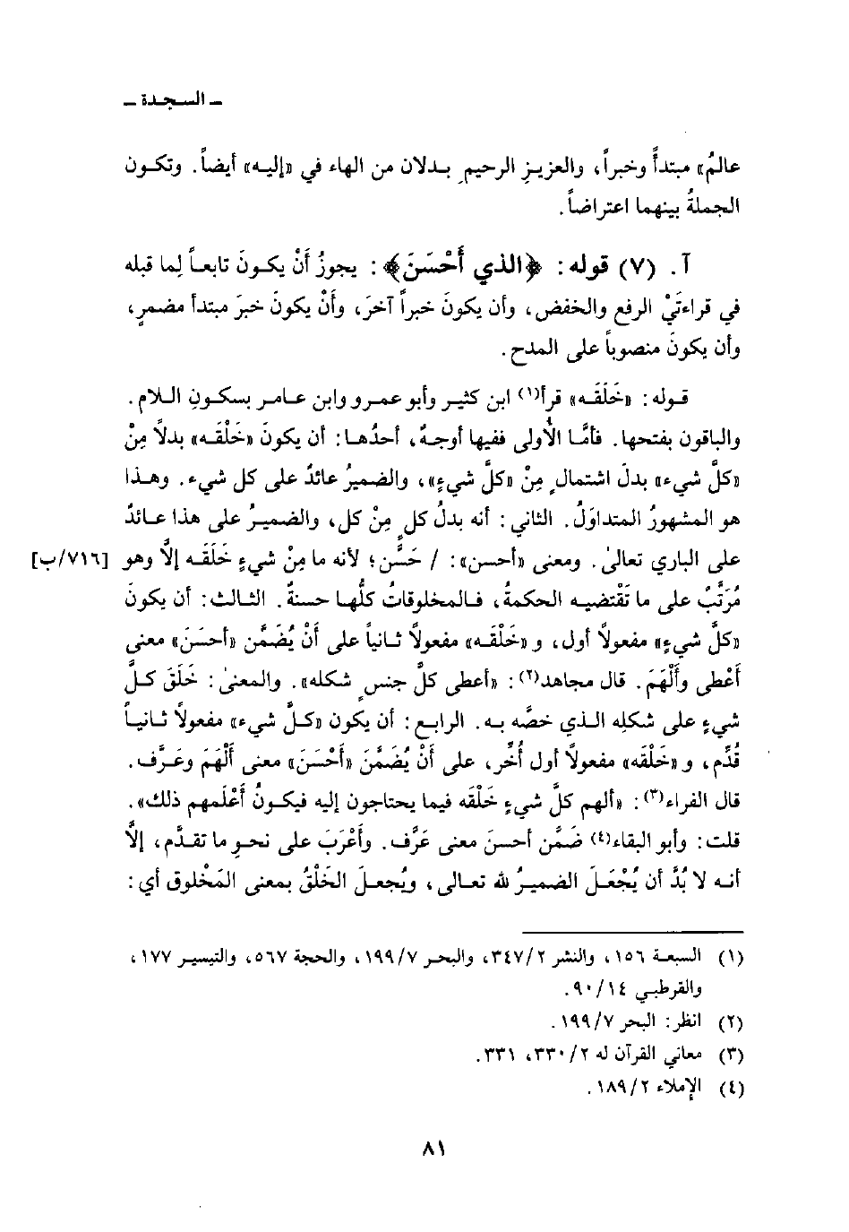 قوله: «خَلَقَه» قرأ ابن كثير وأبو عمرو وابن عامر بسكونِ اللام. والباقون بفتحها. فأمَّا الأُولى ففيها أوجهٌ، أحدُها: أن يكونَ «خَلْقَه» بدلاً مِنْ «كلَّ شيء» بدلَ اشتمالٍ مِنْ «كلَّ شيءٍ» ، والضميرُ عائدٌ على كل شيء. وهذا هو المشهورُ المتداوَلُ. الثاني: أنه بدلُ كلٍ مِنْ كل، والضميرُ على هذا عائدٌ على الباري تعالى. ومعنى «أحسن» : /حَسَّن؛ لأنه ما مِنْ شيءٍ خَلَقَه إلاَّ وهو مُرَتَّبٌ على ما تَقْتَضيه الحكمةُ، فالمخلوقاتُ كلُّها حسنةٌ. الثالث: أن يكونَ «كلَّ شيءٍ» مفعولاً أول، و «خَلْقَه» مفعولاً ثانياً على أَنْ يُضَمَّن «أحسَنَ» معنى أَعْطى وأَلْهَمَ. قال مجاهد: «أعطى كلَّ جنسٍ شكله» . والمعنى: خَلَقَ كلَّ شيءٍ على شكلِه الذي خصَّه به. الرابع: أن يكون «كلَّ شيء» مفعولاً ثانياً قُدِّم، و «خَلْقَه» مفعولاً أول أُخِّر، على أَنْ يُضَمَّنَ «أَحْسَنَ» معنى أَلْهَمَ وعَرَّف. قال الفراء: «ألهم كلَّ شيءٍ خَلْقَه فيما يحتاجون إليه فيكونُ أَعْلَمهم ذلك» . قلت: وأبو البقاء ضَمَّن أحسنَ معنى عَرَّف. وأَعْرَبَ على نحوِ ما تقدَّم، إلاَّ أنه لا بُدَّ أن يُجْعَلَ الضميرُ لله تعالى، ويُجعلَ الخَلْقُ بمعنى المَخْلوق أي: