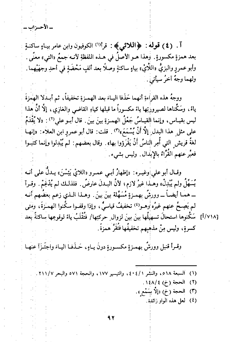 وقال أبو علي وغيره: «إظهارُ أبي عمرو» اللايْ يَئِسْنَ «يدلُّ على أنه يُسَهِّلُ ولم يُبْدِلْ» وهذا غيرُ لازم؛ لأنَّ البدلَ عارضٌ. فلذلك لم يُدْغِمْ. وقرآ - هما أيضاً - وورشٌ بهمزةٍ مُسَهَّلة بينَ بينَ. وهذا الذي زعم بعضُهم أنه لم يَصِحَّ عنهم غيرُه وهو تخفيفٌ قياسيٌّ، وإذا وقفوا سكَّنوا الهمزةَ، ومتى سَكَّنوها استحالَ تسهيلُها بينَ بينَ لزوالِ حركتِها/ فتُقْلَبُ ياءً لوقوعِها ساكنةً بعد كسرةٍ، وليس مِنْ مذهبِهم تخفيفُها فتُقَرَّ همزةً.
