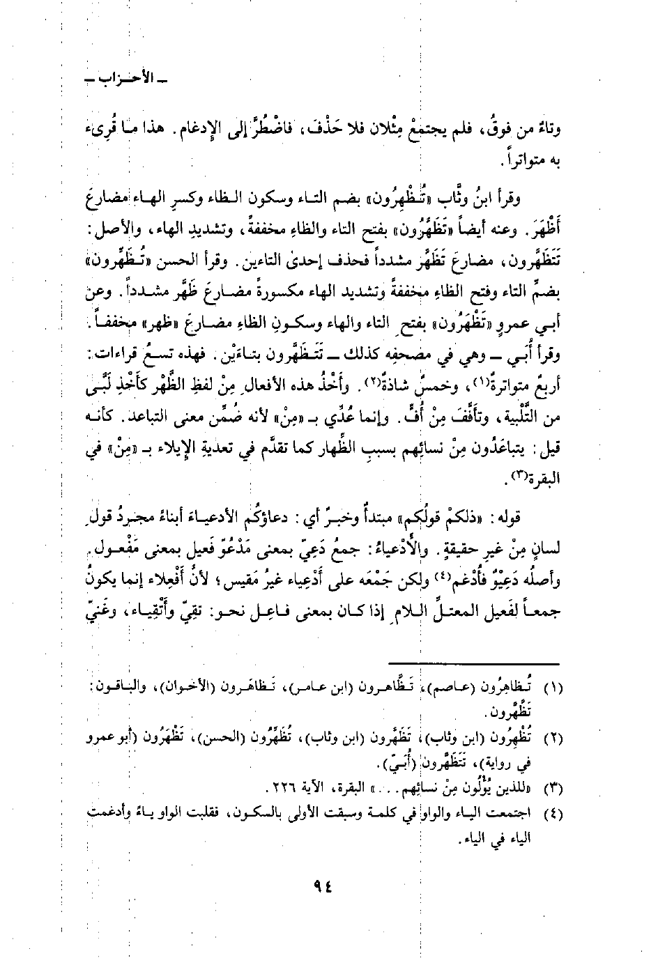 وقرأ ابنُ وثَّاب «تُظْهِرُون» بضم التاء وسكون الظاء وكسرِ الهاء مضارعَ أَظْهَرَ. وعنه أيضاً «تَظَهَّرُون» بفتح التاء والظاءِ مخففةً، وتشديدِ الهاء، والأصل: تَتَظَهَّرون، مضارعَ تَظَهَّر مشدداً فحذف إحدى التاءين. وقرأ الحسن «تُظَهِّرون» بضمِّ التاء وفتح الظاءِ مخففةً وتشديد الهاء مكسورةً مضارعَ ظَهَّر مشدداً. وعن أبي عمروٍ «تَظْهَرُون» بفتحِ التاء والهاء وسكونِ الظاءِ مضارعَ «ظهر» مخففاً. وقرأ أُبَي - وهي في مصحفِه كذلك - تَتَظَهَّرون بتاءَيْن. فهذه تسعُ قراءات: أربعٌ متواترةٌ، وخمسٌ شاذةٌ. وأَخْذُ هذه الأفعالِ مِنْ لفظِ الظَّهْر كأَخْذِ لَبَّى من التَّلْبية، وتأَفَّفَ مِنْ أُفٍّ. وإنما عُدِّي ب «مِنْ» لأنه ضُمِّن معنى التباعد. كأنه قيل: يتباعَدُون مِنْ نسائِهم بسببِ الظِّهار كما تقدَّم في تعديةِ الإِيلاء ب «مِنْ» في البقرة.