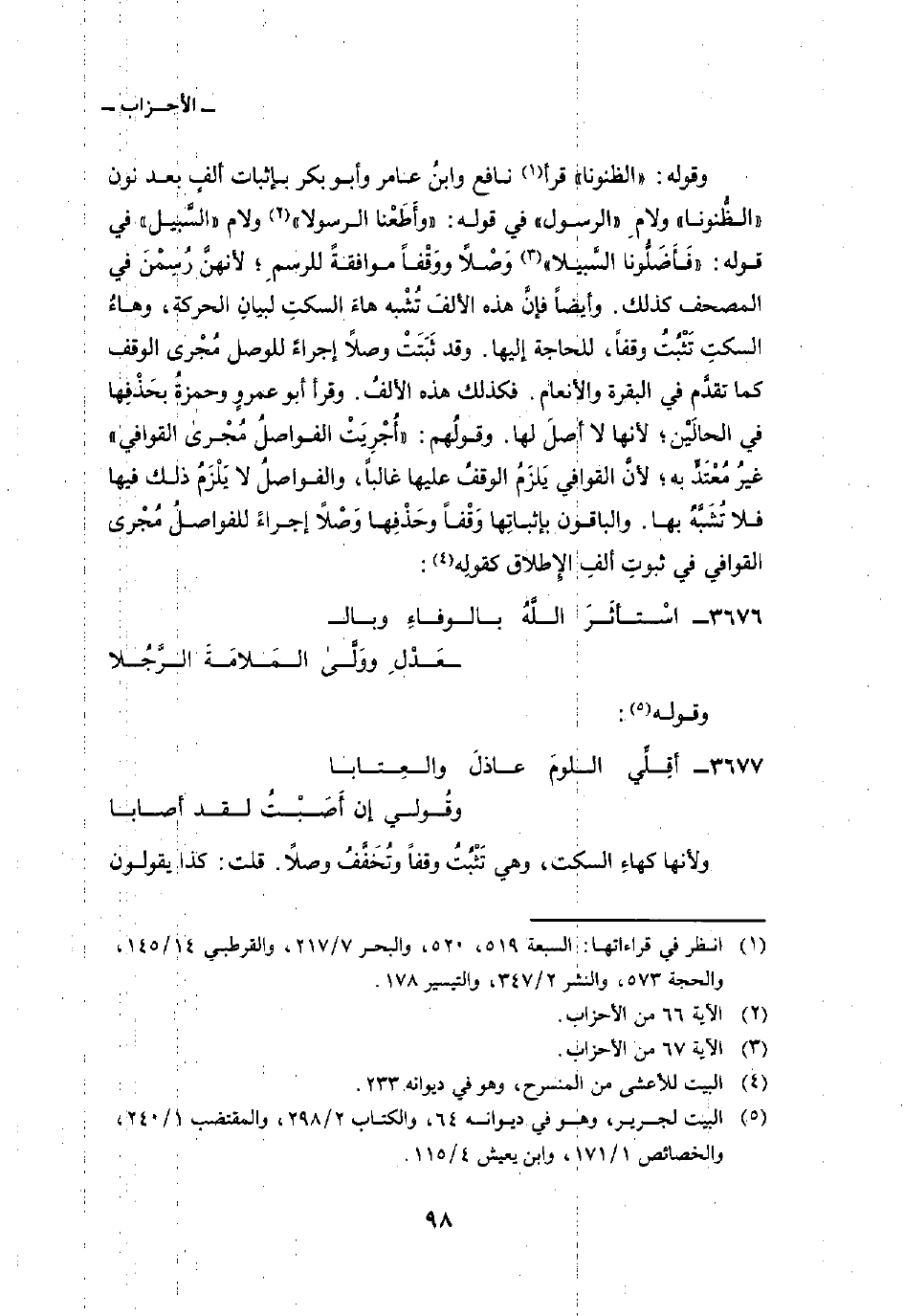 وقوله: «الظنونا» قرأ نافع وابنُ عامر وأبو بكر بإثبات ألفٍ بعد نون «الظُّنونا» ولامِ «الرسول» في قوله: {وَأَطَعْنَا الرسولا} [الأحزاب: 66] ولام «السَّبيل» في قوله: {فَأَضَلُّونَا السبيلا} [الأحزاب: 67] وَصْلاً ووَقْفاً موافقةً للرسمِ؛ لأنهنَّ رُسِمْنَ في المصحف كذلك. وأيضاً فإنَّ هذه الألفَ تُشْبه هاءَ السكتِ لبيانِ الحركة، وهاءُ السكتِ تَثْبُتُ وقفاً، للحاجة إليها. وقد ثَبَتَتْ وصلاً إجراءً للوصل مُجْرى الوقف كما تقدَّم في البقرة والأنعام. فكذلك هذه الألفُ. وقرأ أبو عمروٍ وحمزةُ بحَذْفِها في الحالَيْن؛ لأنها لا أصلَ لها. وقولُهم: «أُجْرِيَتْ الفواصلُ مُجْرى القوافي» غيرُ مُعْتَدٍّ به؛ لأنَّ القوافي يَلزَمُ الوقفُ عليها غالباً، والفواصلُ لا يَلْزَمُ ذلك فيها فلا تُشَبَّهُ بها. والباقون بإثباتِها وَقْفاً وحَذْفِها وَصْلاً إجراءً للفواصلُ مُجْرى القوافي في ثبوتِ ألفِ الإِطلاق كقولِه: