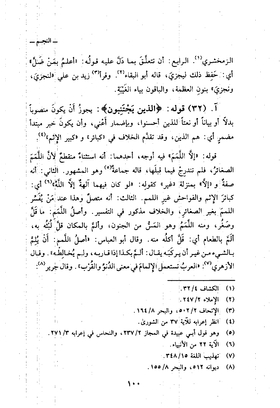 قوله: {إِلاَّ اللمم} فيه أوجه، أحدهما: أنه استثناءٌ منقطعٌ لأنَّ اللَّمَمَ الصغائرُ، فلم تندرِجْ فيما قبلَها، قاله جماعةٌ وهو المشهور. الثاني: أنه صفةٌ و «إلاَّ» بمنزلة «غير» كقولِه: {لَوْ كَانَ فِيهِمَآ آلِهَةٌ إِلاَّ الله} [الأنبياء: 22] أي: كبائرَ الإِثم والفواحش غيرِ اللمم. الثالث: أنه متصلٌ وهذا عند مَنْ يُفَسِّر اللممَ بغير الصغائرِ، والخلاف مذكور في التفسير. وأصلُ اللَّمَم: ما قَلَّ وصَغُر، ومنه اللَّمَمُ وهو المَسُّ من الجنون، وألمَّ بالمكان قلَّ لُبْثُه به، ألَمَّ بالطعام أي: قَلَّ أكلُه منه. وقال أبو العباس: «أًصلُ اللَّمم: أَنْ يُلِمَّ بالشيء من غير أن يركَبَه يقال: ألمَّ بكذا إذا قاربه، ولم يُخالِطْه» . وقال الأزهري: «العربُ تستعمل الإِلمامَ في معنى الدُنوِّ والقُرْب» . وقال جرير: