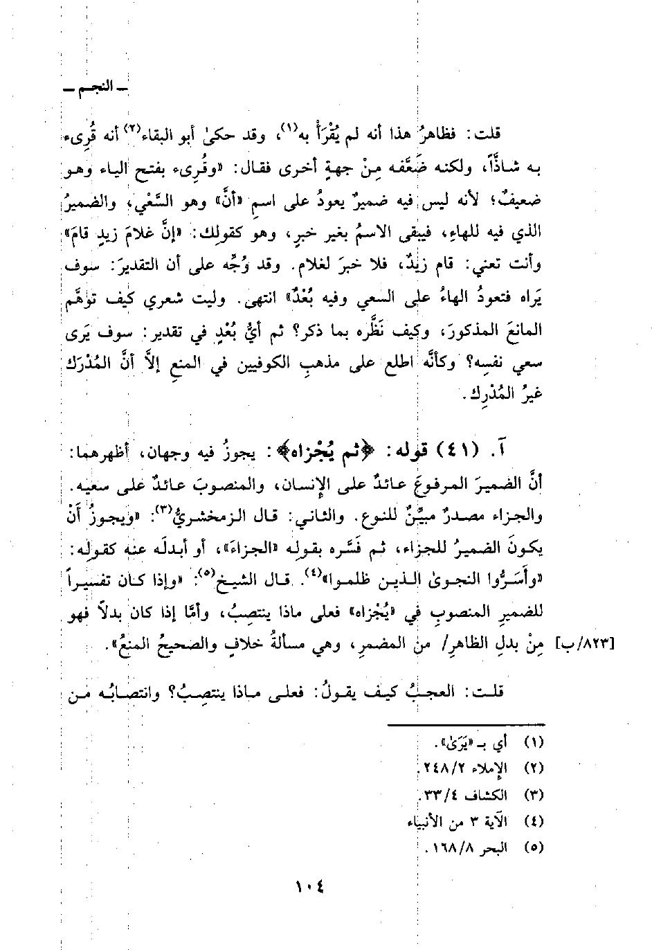 قوله: {ثُمَّ يُجْزَاهُ} : يجوزُ فيه وجهان، أظهرهما: أنَّ الضميرَ المرفوعَ عائدٌ على الإِنسان، والمنصوبَ عائدٌ على سعيه. والجزاء مصدرٌ مبيِّنٌ للنوع. والثاني: قال الزمخشريُّ: «ويجوزُ أَنْ يكونَ الضميرُ للجزاء، ثم فَسَّره بقولِه» الجزاءَ «، أو أبدلَه عنه كقولِه: {وَأَسَرُّواْ النجوى الذين ظَلَمُواْ} [الأنبياء: 3] . قال الشيخ:» وإذا كان تفسيراً للضميرِ المنصوبِ في «يُجْزاه» فعلى ماذا ينتصِبُ، وأمَّا إذا كان بدلاً فهو مِنْ بدلِ الظاهرِ/ من المضمرِ، وهي مسألةُ خلافٍ والصحيحُ المنعُ «.