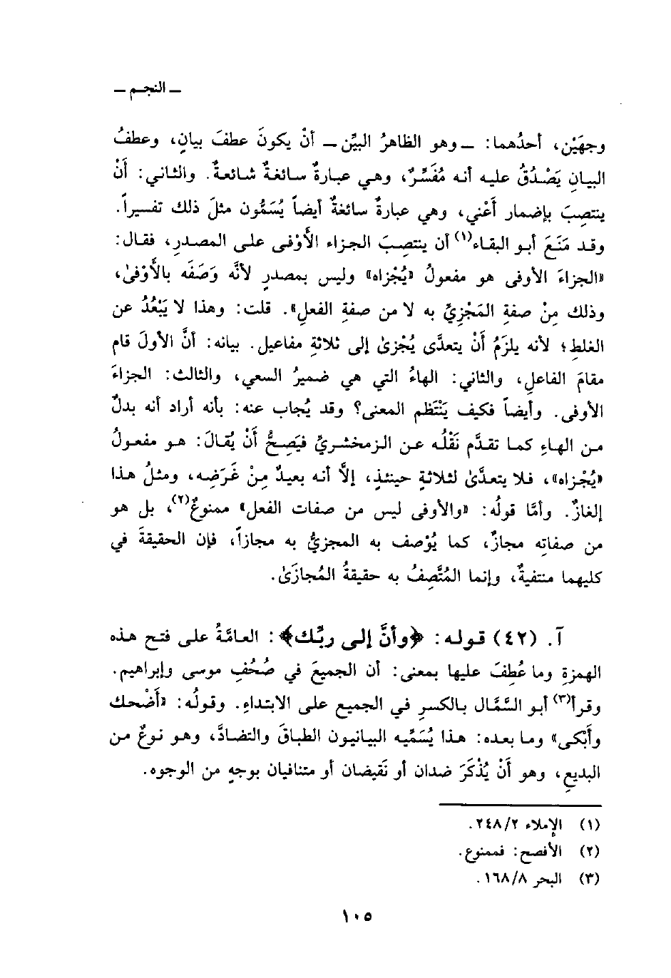 قوله: {وَأَنَّ إلى رَبِّكَ} : العامَّةُ على فتح هذه الهمزةِ وما عُطِفَ عليها بمعنى: أن الجميعَ في صُحُفِ موسى وإبراهيم. وقرأ أبو السَّمَّال بالكسرِ في الجميع على الابتداءِ. وقولُه: «أَضْحك وأَبْكى» وما بعده: هذا يُسَمِّيه البيانيون الطباقَ والتضادَّ، وهو نوعٌ من البديعِ، وهو أَنْ يُذْكَرَ ضدان أو نَقْيضان أو متنافيان بوجهٍ من الوجوه.