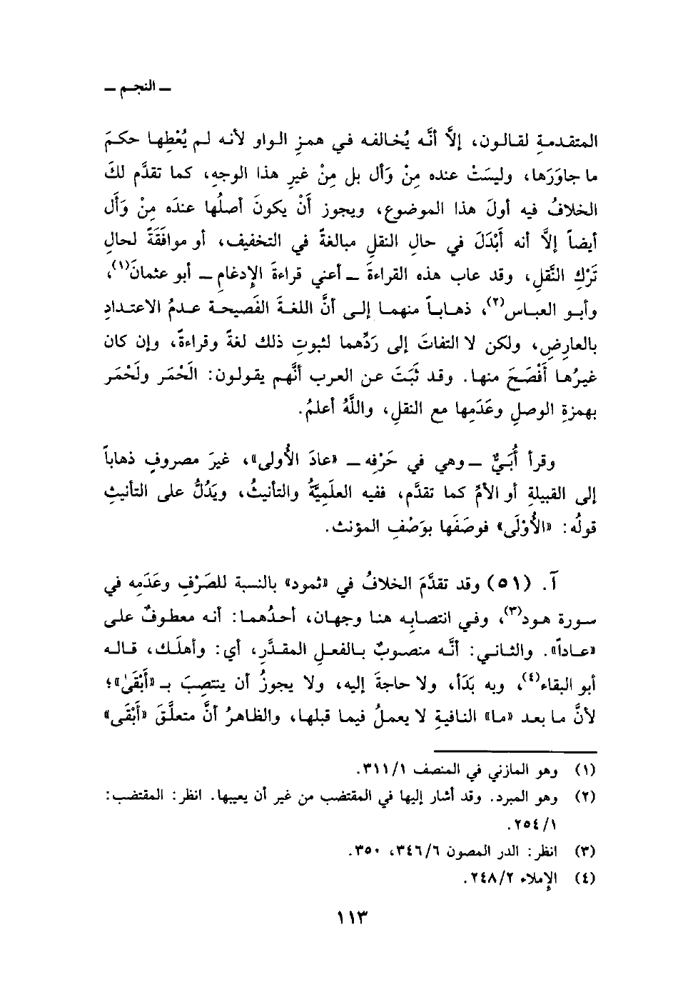 وقرأ أُبَيٌّ وهي في حَرْفِه «عادَ الأُولى» ، غيرَ مصروفٍ ذهاباً إلى القبيلةِ أو الأمِّ كما تقدَّم، ففيه العلَمِيَّةُ والتأنيثُ، ويَدُلُّ على التأنيثِ قولُه: «الأُوْلَى» فوصَفَها بوَصْفِ المؤنث.