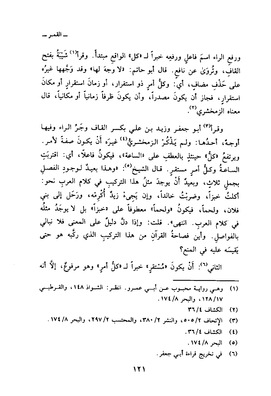 وقرأ أبو جعفر وزيد بن علي بكسر القاف وجَرِّ الراء وفيها أوجهٌ، أحدُها: ولم يَذْكُرْ الزمخشريُّ غيرَه أَنْ يكونَ صفةً لأمر. ويرتفعُ «كلُّ» حينئذٍ بالعطفِ على «الساعة» ، فيكونُ فاعلاً، أي: اقتربَتِ الساعةُ وكلُّ أمرٍ مستقرٍ. قال الشيخ: «وهذا بعيدٌ لوجودِ الفصلِ بجملٍ ثلاثٍ، وبعيدٌ أَنْ يوجدَ مثلُ هذا التركيبِ في كلام العربِ نحو: أكلتُ خبزاً، وضربْتُ خالداً، وإن يَجِىءْ زيدٌ أُكْرِمْه، ورَحَل إلى بني فلان، ولحماً، فيكونُ» ولحماً «معطوفاً على» خبزاً «بل لا يوجَدُ مثلُه في كلام العربِ. انتهى» . قلت: وإذا دلَّ دليلٌ على المعنى فلا نبالي بالفواصلِ. وأين فصاحةُ القرآن من هذا التركيبِ الذي ركَّبه هو حتى يَقيسَه عليه في المنع؟