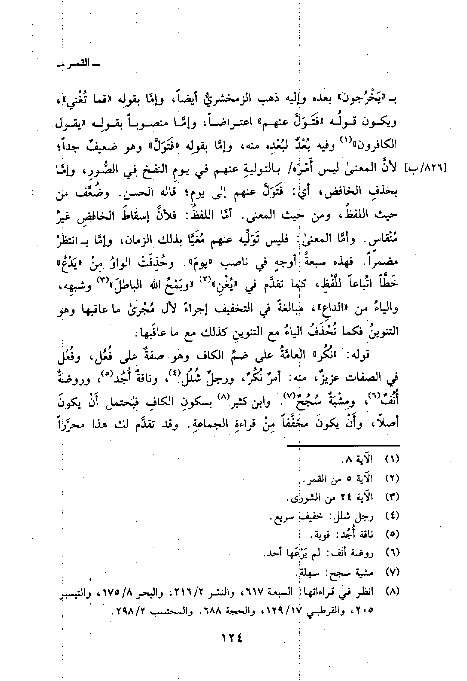 ب «يَخْرُجون» بعده وإليه ذهب الزمخشريُّ أيضاً، وإمَّا بقولِه «فما تُغْني» ، ويكون قولُه «فَتَوَلَّ عنهم» اعتراضاً، وإمَّا منصوباً بقولِه {يَقُولُ الكافرون} [القمر: 8] وفيه بُعْدٌ لبُعْدِه منه، وإمَّا بقولِه «فَتَوَلَّ» وهو ضعيفٌ جداً؛ لأنَّ المعنى ليس أَمْرَه/ بالتوليةِ عنهم في يومِ النفخ في الصُّورِ، وإمَّا بحذفِ الخافض، أي فَتَوَلَّ عنهم إلى يوم؛ قاله الحسن. وضُعِّف من حيث اللفظُ، ومن حيث المعنى. أمَّا اللفظُ: فلأنَّ إسقاطَ الخافضِ غيرُ مُنْقاسٍ. وأمَّا المعنى: فليس تَوَلِّيه عنهم مُغَيَّا بذلك الزمان، وإمَّا ب انتظرْ مضمراً. فهذه سبعةُ أوجهٍ في ناصب «يومَ» . وحُذِفَتْ الواوُ مِنْ «يَدْعُ» خَطَّاً اتِّباعاً للِّفْظِ، كما تقدَّم في {يُغْنِ} {وَيَمْحُ الله الباطل} [الشورى: 24] وشبهِه، والياءُ من «الداعِ» ، مبالغةً في التخفيف إجراءً لأل مُجْرى ما عاقبها وهو التنوينُ فكما تُحْذَفُ الياءُ مع التنوينِ كذلك مع ما عاقَبها.
