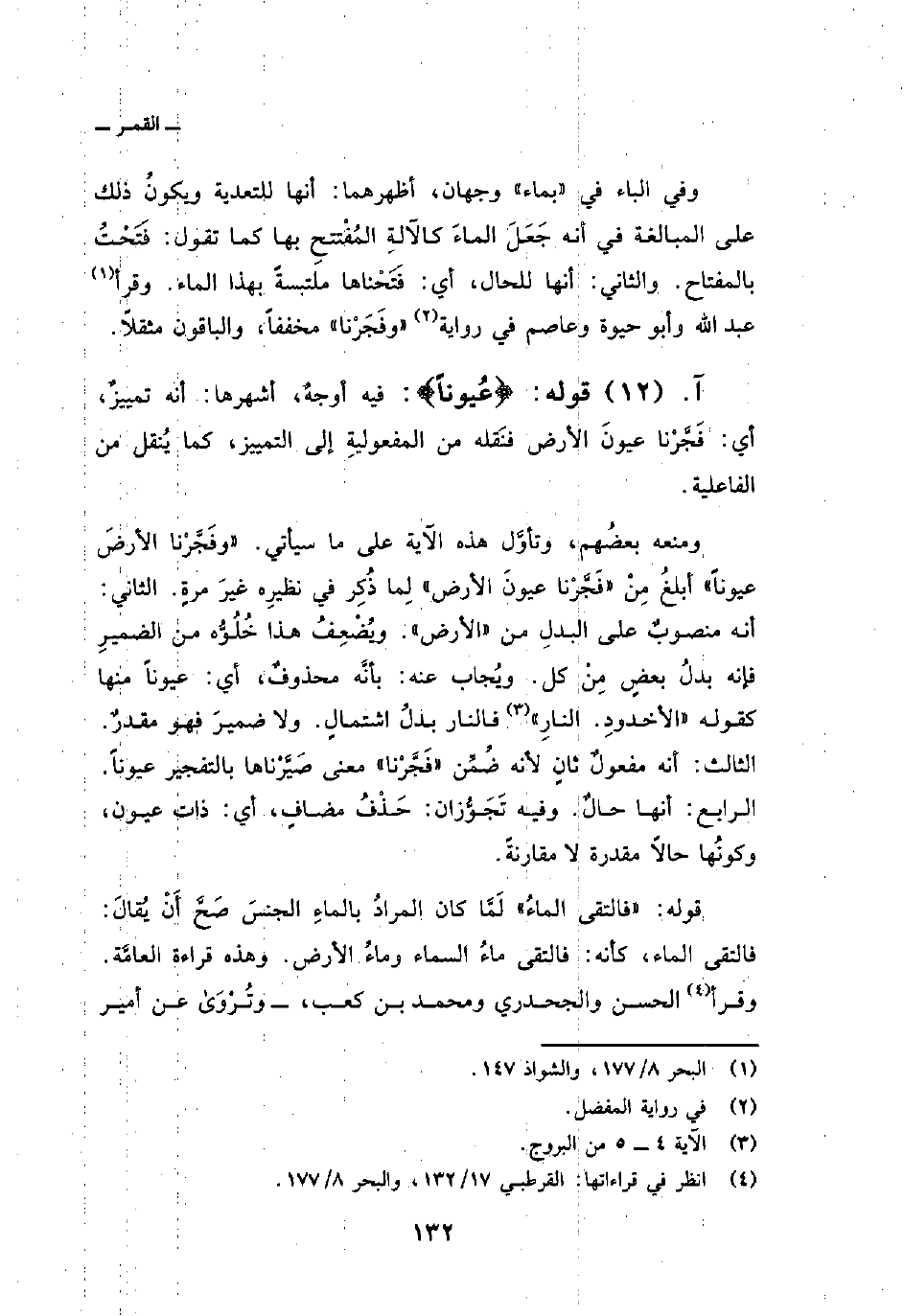 ومنعه بعضُهم، وتأوَّل هذه الآية على ما سيأتي: {وَفَجَّرْنَا الأرض عُيُوناً} أبلغُ مِنْ «فَجَّرْنا عيونَ الأرض» لِما ذُكِر في نظيرِه غيرَه مرةٍ. الثاني: أنه منصوبٌ على البدلِ من «الأرض» . ويُضْعِفُ هذا خُلُوُّه من الضميرِ فإنه بدلُ بعضٍ مِنْ كل. ويُجاب عنه: بأنَّه محذوفٌ، أي: عيوناً منها كقوله {الأخدود النار} [البروج: 4-5] فالنار بدلُ اشتمالٍ. ولا ضميرَ فهو مقدرٌ. الثالث: أنه مفعولٌ ثانٍ لأنه ضُمِّن «فَجَّرنا» معنى صَيَّرْناها بالتفجير عيوناً. الرابع: أنها حالٌ. وفيه تَجَوُّزان: حَذْفُ مضافٍ، أي: ذات عيون، وكونُها حالاً مقدرة لا مقارنةً.