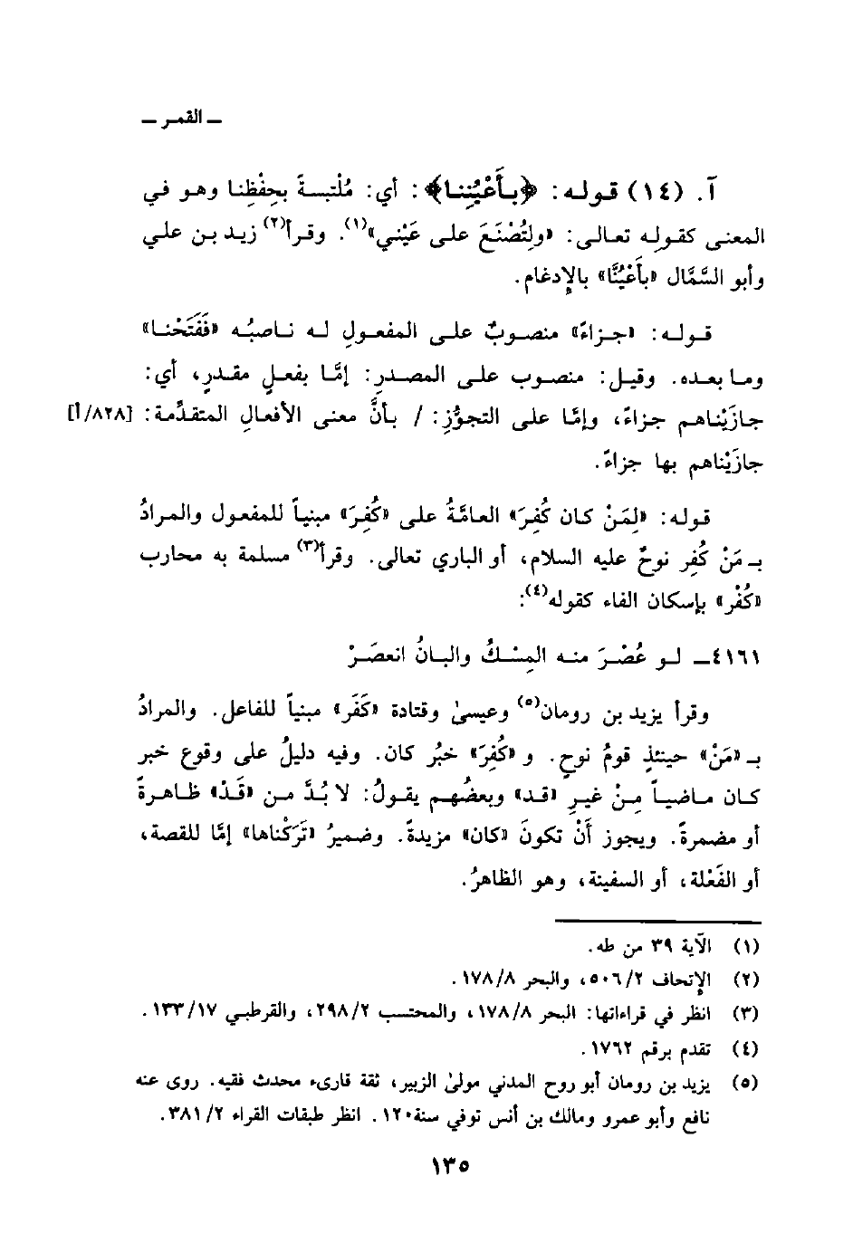 قوله: {لِّمَن كَانَ كُفِرَ} العامَّةُ على «كُفِرَ» مبنياً للمفعول والمرادُ ب مَنْ كُفِر نوحٌ عليه السلام، أو الباري تعالى. وقرأ مسلمة به محارب «كُفْر» بإسكان الفاء كقوله: