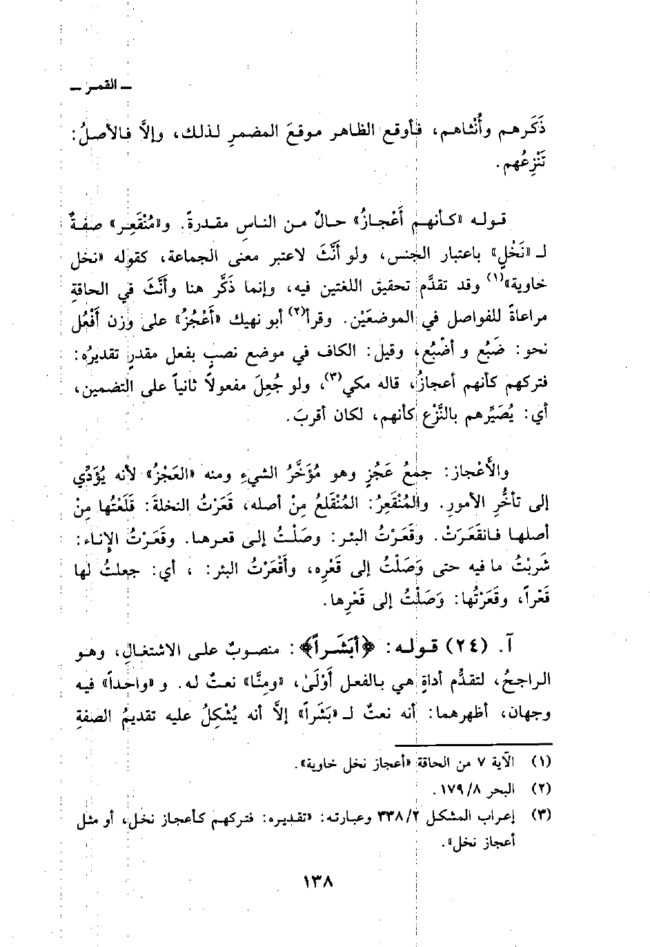والأَعْجاز: جمعُ عَجُزٍ وهو مُؤَخَّرُ الشيءِ ومنه «العَجْزُ» لأنه يُؤَدِّي إلى تأخُّرِ الأمورِ. والمُنْقَعِرُ: المُنْقَلعُ مِنْ أصله، قَعَرْتُ النخلةَ: قَلَعْتُها مِنْ أصلها فانقَعَرَتْ. وقَعَرْتُ البئر: وصَلْتُ إلى قعرها. وقَعَرْتُ الإِناء: شَربْتُ ما فيه حتى وَصَلْتُ إلى قَعْرِه، وأَقْعَرْتُ البئر:، أي: جعلتُ لها قَعْراً، وقَعَرْتُها: وَصَلْتُ إلى قَعْرها.
