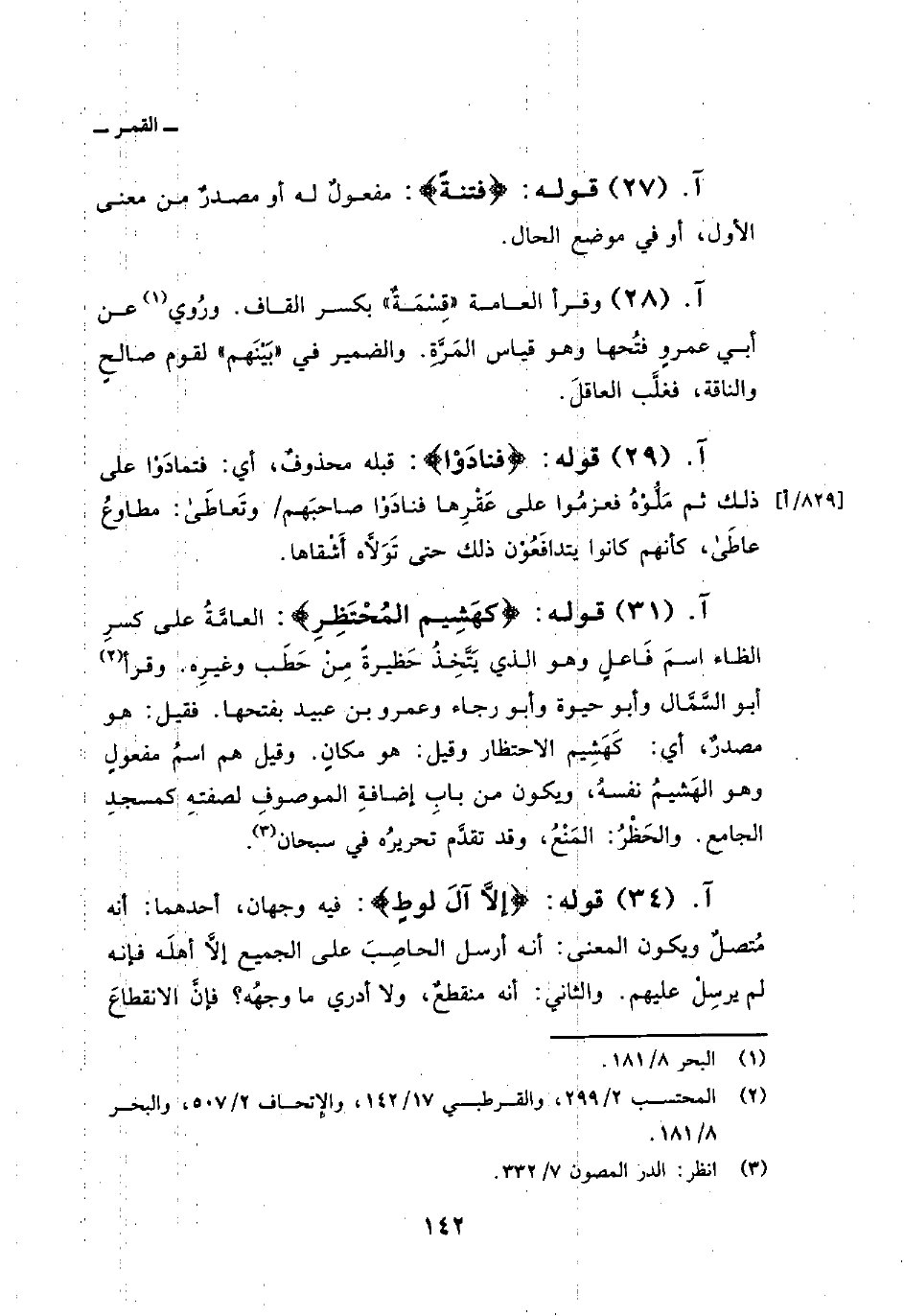 قوله: {كَهَشِيمِ المحتظر} : العامَّةُ على كسر الظاء اسمَ فَاعلٍ وهو الذي يَتَّخِذُ حَظيرةً مِنْ حَطَب وغيرِه. وقرأ أبو السَّمَّال وأبو حيوة وأبو رجاء وعمرو بن عبيد بفتحها. فقيل: هو مصدرٌ، أي: كَهَشِيم الاحتظار وقيل: هو مكانٍ. وقيل هم اسمُ مفعولٍ وهو الهَشيمُ نفسهُ، ويكون من بابِ إضافةِ الموصوفِ لصفتِه كمسجدِ الجامع. والحَظْرُ: المَنْعُ، وقد تقدَّم تحريرُه في سبحان.
