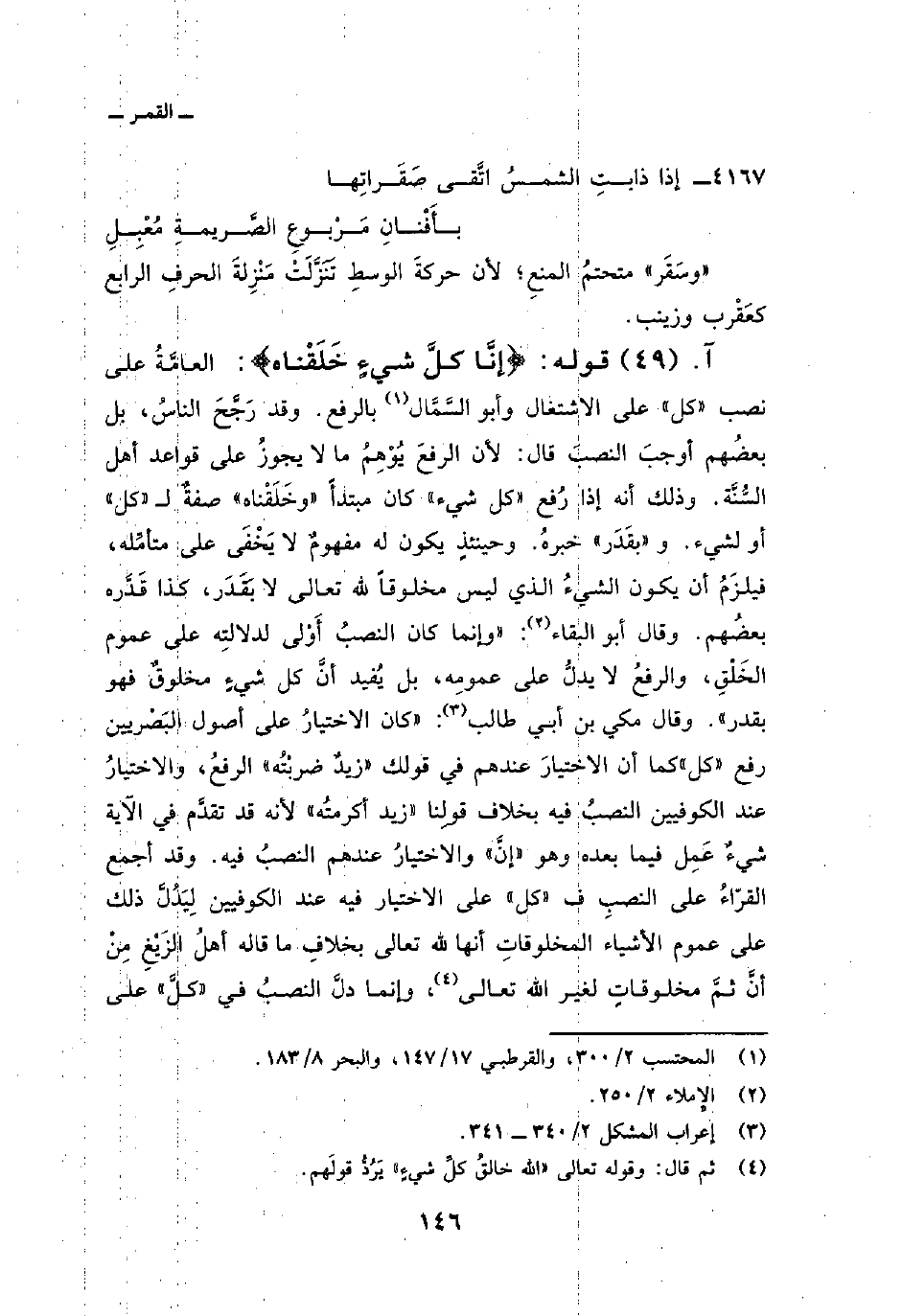 قوله: {إِنَّا كُلَّ شَيْءٍ خَلَقْنَاهُ} : العامَّةُ على نصب «كل» على الاشتغال وأبو السَّمَّال بالرفع. وقد رَجَّحَ الناسُ، بل بعضُهم أوجبَ النصبَ قال: لأن الرفعَ يُوْهِمُ ما لا يجوزُ على قواعد أهل السُّنَّة. وذلك أنه إذا رُفع «كل شيء» كان مبتدأً «وخَلَقْناه» صفةٌ ل «كل» أو لشيء. و «بقَدَر» خبرهُ. وحينئذٍ يكون له مفهومٌ لا يَخْفَى على متأمِّله، فيلزَمُ أن يكون الشيءُ الذي ليس مخلوقاً لله تعالى لا بَقَدَر، كذا قَدَّره بعضُهم. وقال أبو البقاء: «وإنما كان النصبُ أَوْلى لدلالتِه على عموم الخَلْقِ، والرفعُ لا يدلُّ على عمومِه، بل يُفيد أنَّ كل شيءٍ مخلوقٌ فهو بقدر» . وقال مكي بن أبي طالب: «كان الاختيارُ على أصول البَصْريين رفع» كل «كما أن الاختيارَ عندهم في قولك» زيدٌ ضربْتُه «الرفعُ، والاختيارُ عند الكوفيين النصبُ فيه بخلاف قولِنا» زيد أكرمتُه «لأنه قد تقدَّم في الآية شيءٌ عَمِل فيما بعده وهو» إنَّ «والاختيارُ عندهم النصبُ فيه. وقد أجمع القرّاءُ على النصبِ ف» كل «على الاختيار فيه عند الكوفيين لِيَدُلُّ ذلك على عموم الأشياء المخلوقاتِ أنها لله تعالى بخلافِ ما قاله أهلُ الزَيْغِ مِنْ أنَّ ثمَّ مخلوقاتٍ لغير الله تعالى، وإنما دلَّ النصبُ في» كلَّ «على