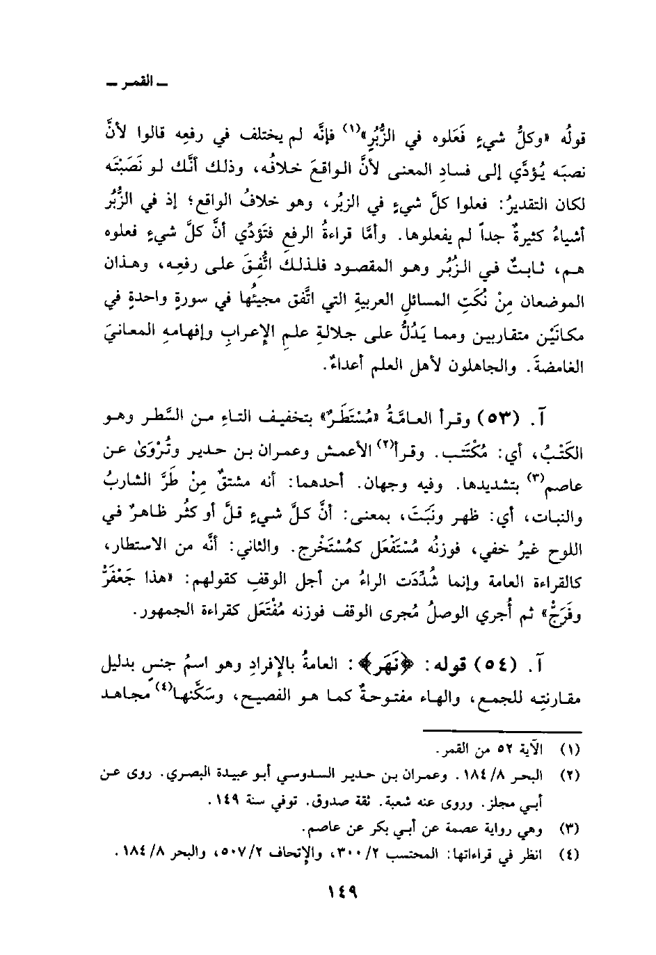 قولُه {وَكُلُّ شَيْءٍ فَعَلُوهُ فِي الزبر} فإنَّه لم يختلف في رفعِه قالوا لأنَّ نصبَه يُؤدَّي إلى فسادِ المعنى لأنَّ الواقعَ خلافُه، وذلك أنَّك لو نَصَبْتَه لكان التقديرُ: فعلوا كلَّ شيءٍ في الزبُر، وهو خلافُ الواقع؛ إذ في الزُّبُر أشياءُ كثيرةٌ جداً لم يفعلوها. وأمَّا قراءةُ الرفعِ فتؤَدِّي أنَّ كلَّ شيءٍ فعلوه هم، ثابتٌ في الزُبُر وهو المقصود فلذلك اتُّفِقَ على رفعِه، وهذان الموضعان مِنْ نُكَتِ المسائلِ العربيةِ التي اتَّفق مجيئُها في سورةٍ واحدةٍ في مكانَيْن متقاربين ومما يَدُلُّ على جلالةِ علمِ الإِعراب وإفهامهِ المعانيَ الغامضةَ. والجاهلون لأهل العلم أعداءٌ.