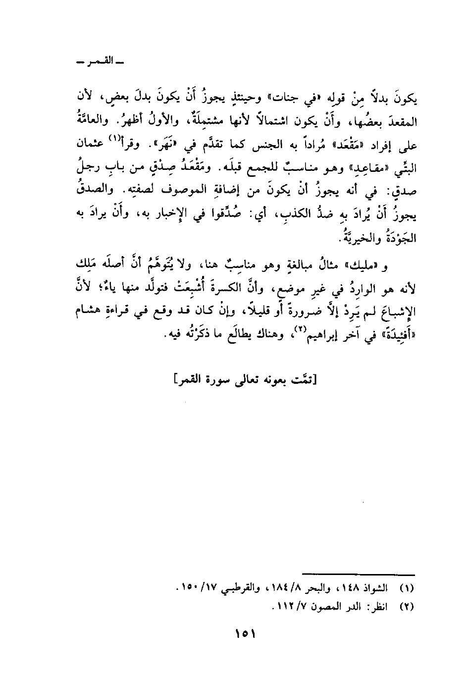 و «مليك» مثلُ مبالغةٍ وهو مناسِبٌ هنا، ولا يُتَوهَّمُ أنَّ أصلَه مَلِك لأنه هو الوارِدُ في غيرِ موضعٍ، وأنَّ الكسرةَ أُشْبِعَتْ فتولَّد منها ياءٌ؛ لأنَّ الإِشباعَ لم يَرِدْ إلاَّ ضرورةً أو قليلاً، وإنْ كان قد وقع في قراءةِ هشام «أَفْئِيدَةً» في آخر إبراهيم، وهناك يطالعَ ما ذكَرْتُه فيه.