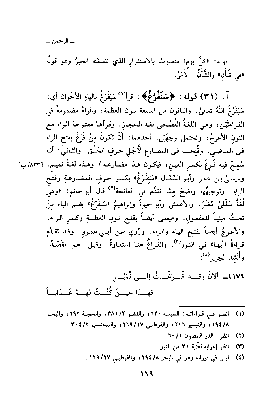 قوله: {سَنَفْرُغُ} : قرأ سَيَفْرُغُ بالياءِ الأخَوان أي: سَيَفْرُغُ اللَّهُ تعالى. والباقون من السبعة بنون العظمة، والراءُ مضمومةٌ في القراءتَيْن، وهي اللغةُ الفُصْحى لغة الحجازِ. وقرأها مفتوحة الراء مع النونِ الأعرجُ، وتحتمل وجهَيْن، أحدهما: أَنْ تكونْ مِنْ فَزَغَ بفتحِ الراء في الماضي، وفُتِحت في المضارع لأَجْلِ حرفِ الحَلْقِ. والثاني: أنه سُمِعَ فيه فَرِغَ بكسرِ العينِ، فيكون هذا مضارعه/ وهذه لغةُ تميمٍ. وعيسى بن عمر وأبو السَّمَّال «سَنِفْرَغُ» بكسر حرفِ المضارعةِ وفتحِ الراءِ. وتوجيهُها واضحٌ مِمَّا تقدَّم في الفاتحة قال أبو حاتم: «وهي لُغَةُ سُفْلى مُضَرَ. والأعمش وأبو حيوةَ وإبراهيمُ» سَنِفْرَغُ «بضم الياء مِنْ تحتُ مبنياً للمفعولِ. وعيسى أيضاً بفتح نونِ العظمةِ وكسرِ الراء. والأعرجُ أيضاً بفتح الياء والراء. ورُوي عن أبي عمروٍ. وقد تقدَّم قراءةُ» أيها «في النور. والفَراغُ هنا استعارةٌ. وقيل: هو القَصْدُ. وأُنْشِد لجرير: