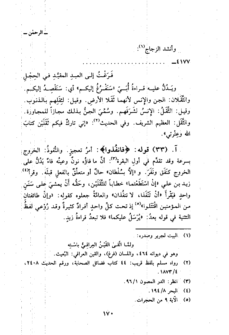 قوله: {فانفذوا} : أمرُ تعجيزٍ: والنُّفوذُ: الخروج بسرعة وقد تقدَّم في أولِ البقرة: أنَّ ما فاؤُه نونٌ وعينُه فاءٌ يَدُلُّ على الخروج كنَفَق ونَفَرَ. و «إلاَّ بسُلْطان» حالٌ أو متعلِّقٌ بالفعلِ قبلَه. وقرأ زيد بن علي «إنْ اسْتَطَعْتما» خطاباً للثَّقَلَيْن، وحَقُّه أَنْ يمشيَ على سَنَنٍ واحدٍ فيَقْرأَ «أنْ تَنْفَذا، لا تنفُذان» والعامَّةُ جعلوه كقولِه: {وَإِن طَآئِفَتَانِ مِنَ المؤمنين اقتتلوا} [الحجرات: 9] إذ تحت كلِّ واحدٍ أفرادٌ كثيرةٌ وقد رُوْعي لفظُ التثنية في قوله بعدُ: «يُرْسَلُ عليكما» فلا تبعدُ قراءةُ زيدٍ.