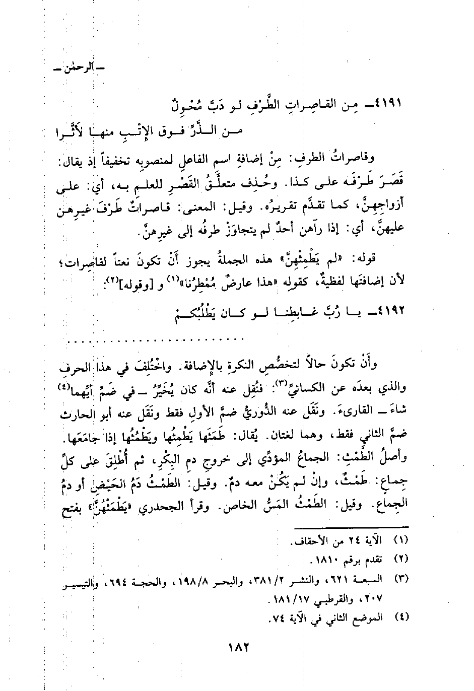 قوله: {لَمْ يَطْمِثْهُنَّ} هذه الجملةُ يجوز أَنْ تكونَ نعتاً لقاصِرات؛ لأن إضافتَها لفظيةٌ، كقولِه {هذا عَارِضٌ مُّمْطِرُنَا} [الأحقاف: 24] و [وقوله] :