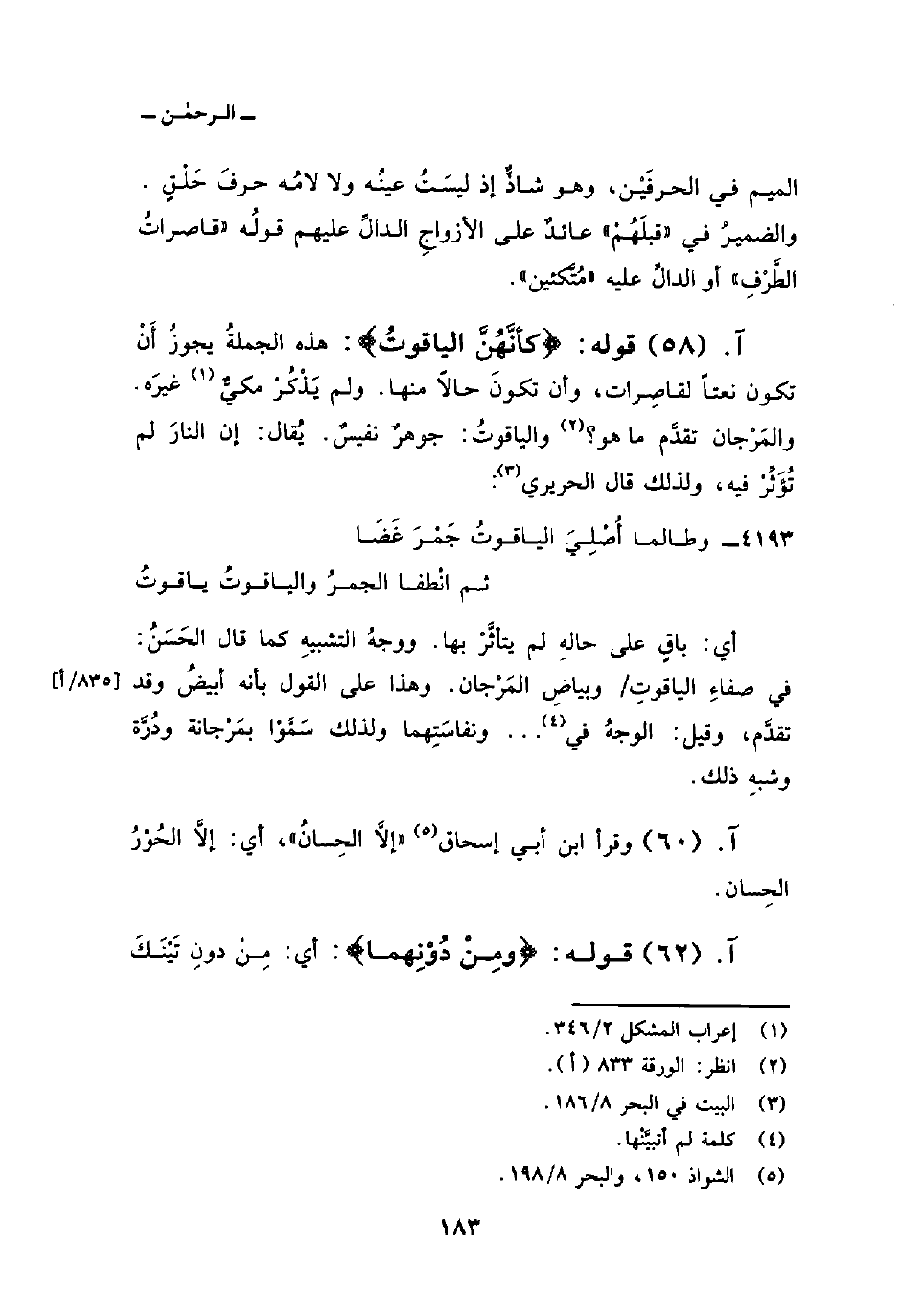 الميم في الحرفَيْن، وهو شاذٌّ إذ ليسَتُ عينُه ولا لامُه حرفَ حَلْقٍ. والضميرُ في» قبلَهُمْ «عائدٌ على الأزواجِ الدالِّ عليهم قولُه» قاصراتُ الطَّرْفِ «أو الدالِّ عليه» مُتَّكئين «.