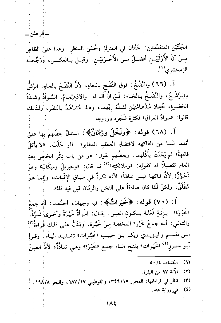 والنَّضْخُ: فوق النَّضْحِ بالحاءِ، لأنَّ النَّضْحَ بالحاءِ: الرَّشُّ والرَّشْحُ، والنَّضْخُ بالخاء: فَوَرانُ الماء. والادْهِيْمامُ: السَّوادُ وشدةُ الخضرةِ، جُعِلا مُدْهامَّتيْن لشدَّة رِيِّهما، وهذا مُشاهَدٌ بالنظر، ولذلك قالوا: «سوادُ العراق» لكثرةِ شَجَره وزروعِه.