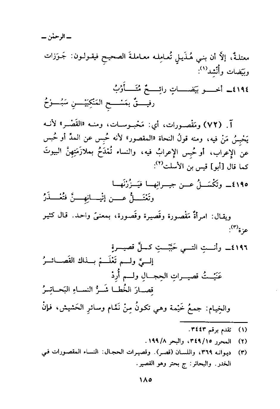 ومَقْصورات، أي: مَحْبوسات، ومنه «القَصْر» لأنه يَحْبِسُ مَنْ فيه، ومنه قولُ النحاة «المقصور» لأنه حُبِس عن المدِّ أو حُبس عن الإِعراب، أو حُبِس الإِعرابُ فيه، والنساء تُمْدَحُ بملازَمَتِهِنَّ البيوتَ كما قال [أبو] قيس بن الأسلت: