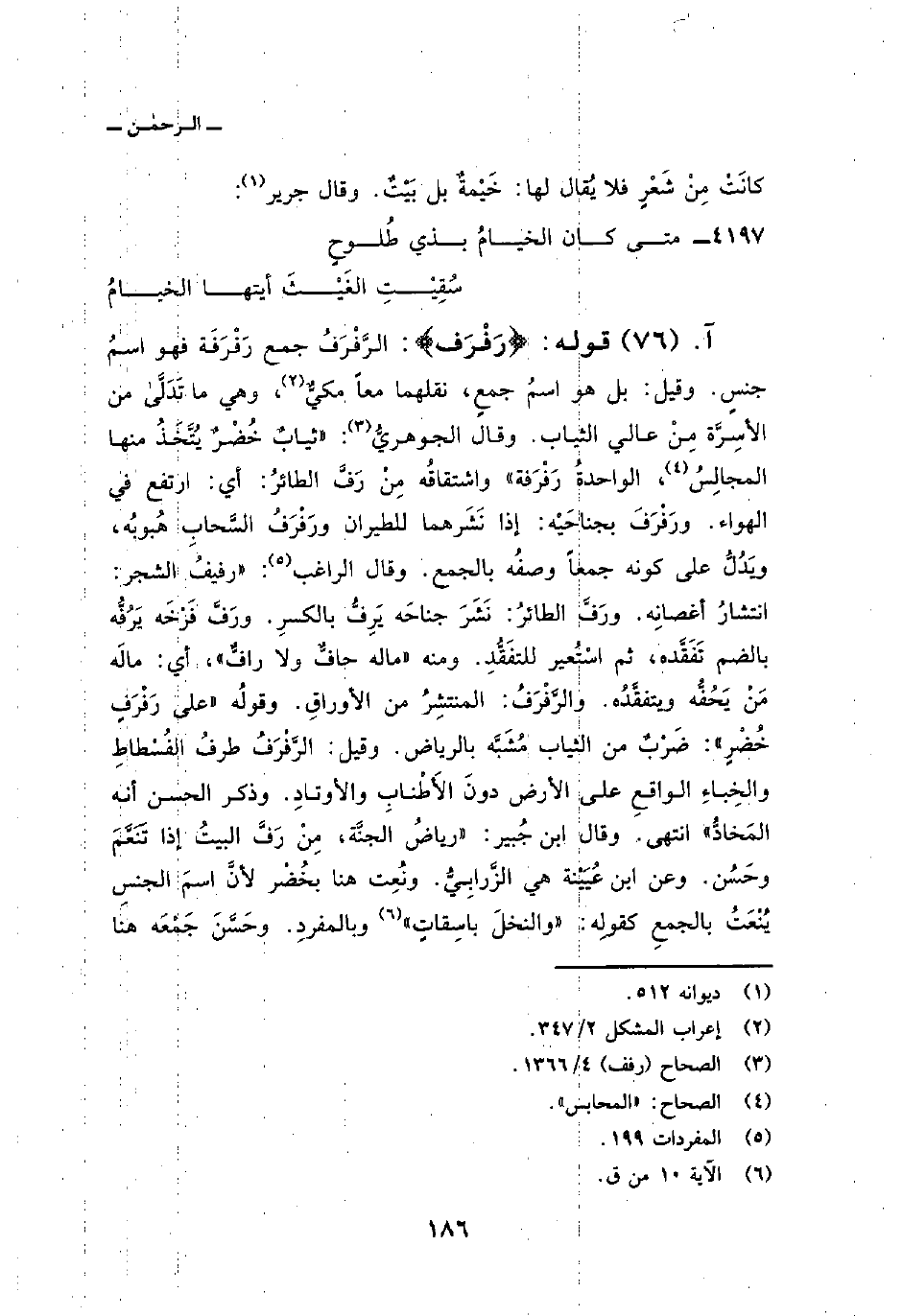قوله: {رَفْرَفٍ} : الرَّفْرَفُ جمع رَفْرَفَة فهو اسمُ جنسٍ. وقيل: بل هو اسمُ جمعٍ، نقلهما معاً مكيٌّ، وهي ما تَدَلَّى من الأسِرَّة مِنْ عالي الثياب. وقال الجوهريُّ: «ثيابٌ خُضْرٌ يُتَّخَذُ منها المجالِسُ، الواحدةُ رَفْرَفة» واشتقاقُه مِنْ رَفَّ الطائرُ: أي: ارتفع في الهواء. ورَفْرَفَ بجناحَيْه: إذا نَشَرهما للطيران ورَفْرَفُ السَّحابِ هُبوبُه، ويَدُلُّ على كونه جمعاً وصفُه بالجمع. وقال الراغب: «رفيفُ الشجر: انتشارُ أغصانِه. ورَفَّ الطائرُ: نَشَرَ جناحَه يَرِفُّ بالكسرِ. ورَفَّ فَرْخَه يَرُفُّه بالضم تَفَقَّده، ثم اسْتُعير للتفَقُّدِ. ومنه» ماله حافٌّ ولا رافٌّ «، أي: مالَه مَنْ يَحُفُّه ويتفقَّدُه. والرَّفْرَفُ: المنتشِرُ من الأوراقِ. وقولُه {على رَفْرَفٍ خُضْرٍ} : ضَرْبٌ من الثياب مُشَبَّه بالرياض. وقيل: الرَّفْرَفُ طرفُ الفُسْطاطِ والخِباءِ الواقعِ على الأرض دونَ الأَطنْابِ والأوتادِ. وذكر الحسن أنه المَخادُّ» انتهى. وقال ابن جُبير: «رياضُ الجنَّة، مِنْ رَفَّ البيتُ إذا تَنَعَّمَ وحَسُن. وعن ابن عُيَيْنة هي الزَّرابِيُّ. ونُعِت هنا بخُضْر لأنَّ اسمَ الجنسِ يُنْعَتُ بالجمعِ كقولِه: {والنخل بَاسِقَاتٍ} [ق: 10] وبالمفرِد. وحَسَّنَ جَمْعَه هنا