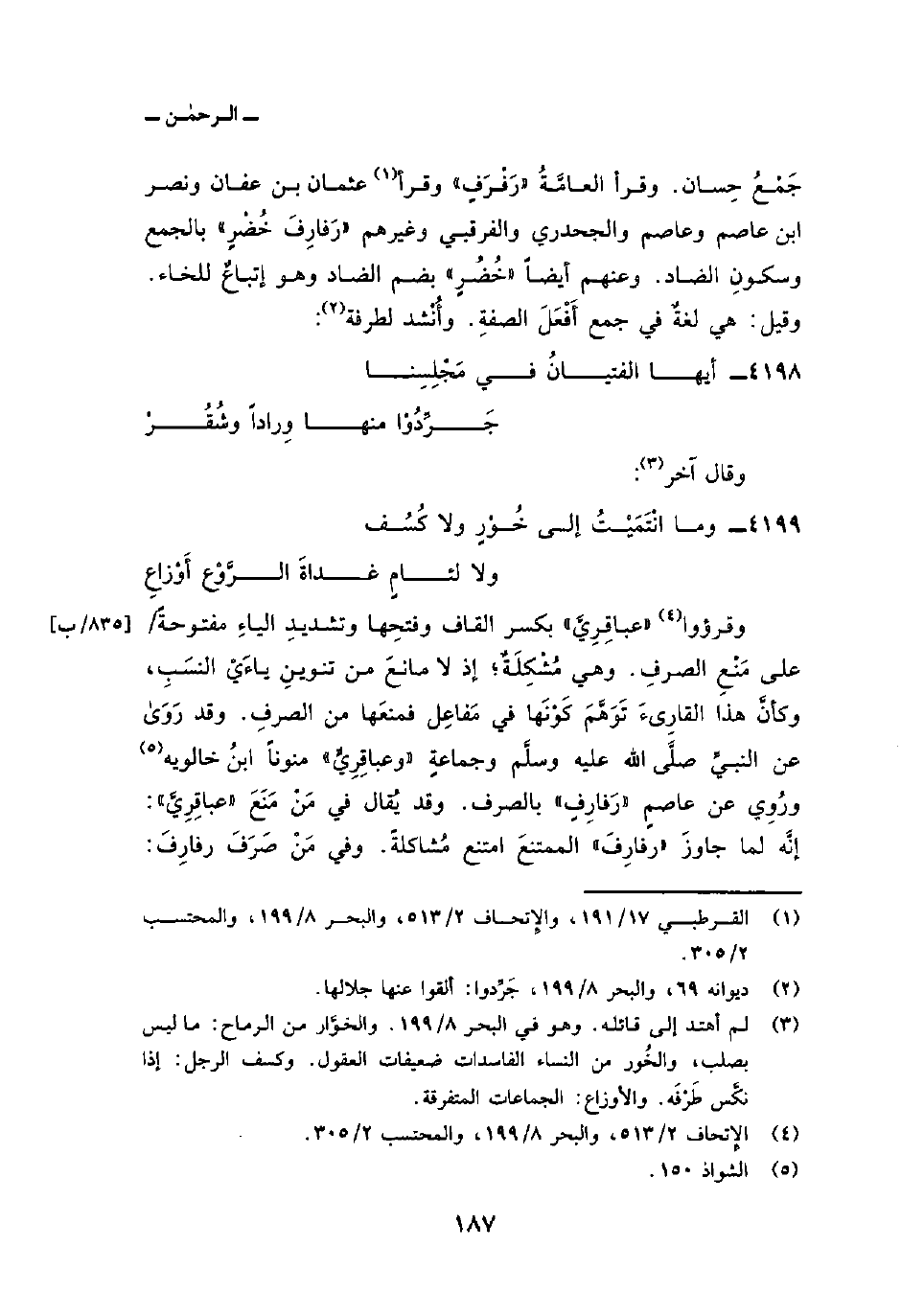 جَمْعُ حِسان. وقرأ العامَّةُ» رَفْرَفٍ «وقرأ عثمان بن عفان ونصر ابن عاصم وعاصم والجحدري والفرقبي وغيرهم» رَفارِفَ خُضْرٍ «بالجمع وسكونِ الضاد. وعنهم أيضاً» خُضُرٍ «بضم الضاد وهو إتباعٌ للخاء. وقيل: هي لغةٌ في جمع أَفْعَلَ الصفةِ. وأُنْشد لطرفة: