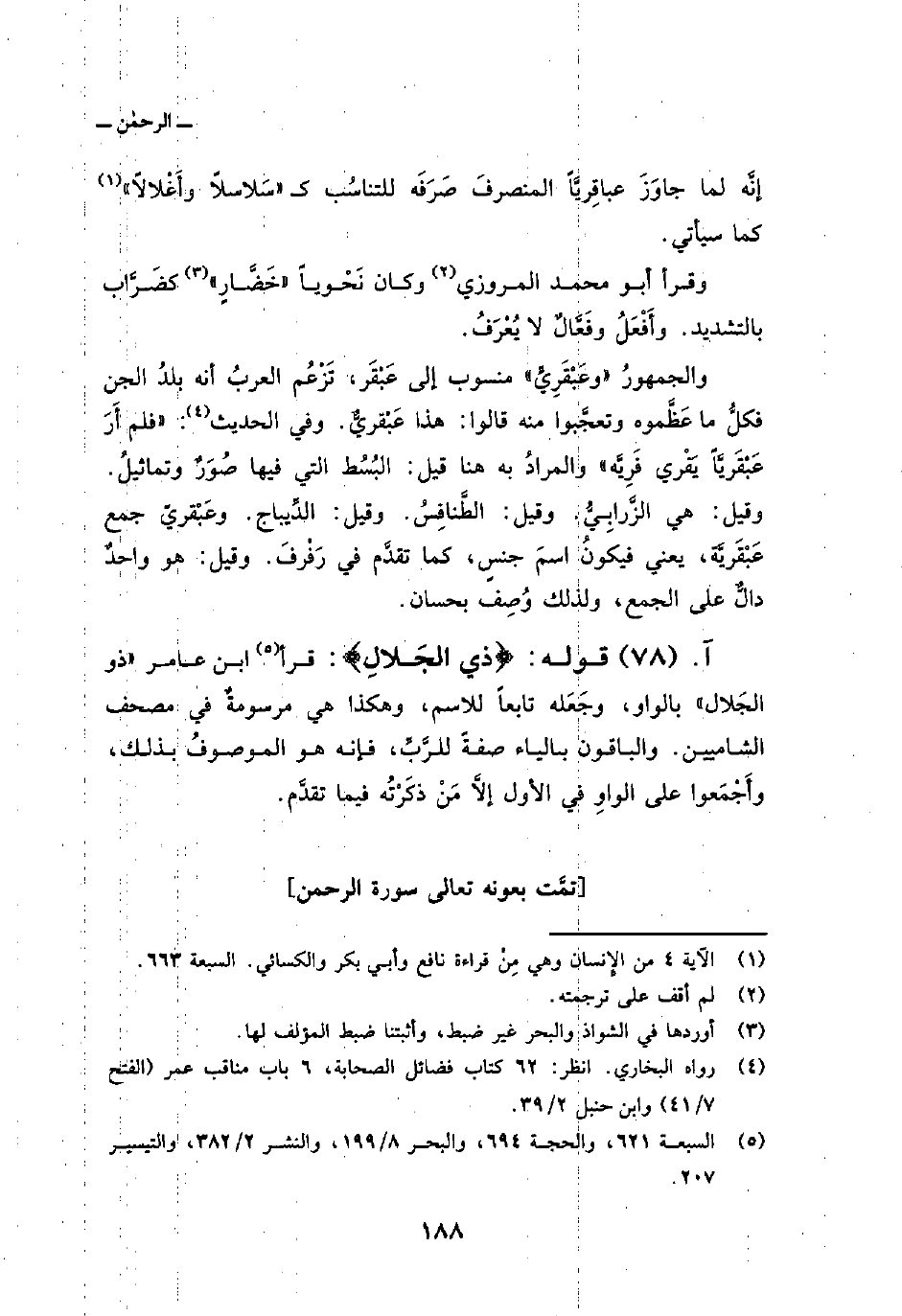 والجمهورُ» وعَبْقِرِيٍّ «منسوب إلى عَبْقَر، تَزْعُم العربُ أنه بلدُ الجن فكلُّ ما عَظَّموه وتعجَّبوا منه قالوا: هذا عَبْقريٌّ. وفي الحديث:» فلم أرَ عَبْقَريَّاً يَفْري فَرِيَّه «والمرادُ به هنا قيل: البُسُط التي فيها صُوَرٌ وتماثيلُ. وقيل: هي الزَّرابِيُّ. وقيل: الطَّنافِسُ. وقيل: الدِّيباج. وعَبْقريّ جمع عَبْقَريَّة، يعني فيكونُ اسمَ جنسٍ، كما تقدَّم في رَفْرفَ. وقيل: هو واحدٌ دالٌّ على الجمع، ولذلك وُصِف بحسان.
