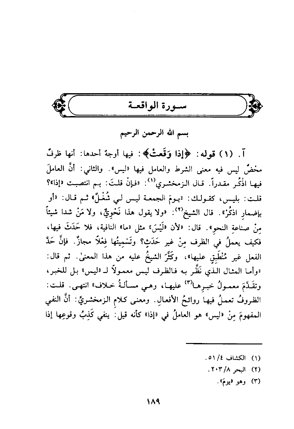 قوله: {إِذَا وَقَعَتِ} : فيها أوجهٌ أحدها: أنها ظرفٌ محْضٌ ليس فيه معنى الشرط والعامل فيها «ليس» . والثاني: أنَّ العاملَ فيها اذْكُر مقدراً. قال الزمخشري: «فإنْ قلتَ: بم انتصبت» إذا «؟ قلت: بليس، كقولك:» يومَ الجمعة ليس لي شُغْلٌ «ثم قال:» أو بإضمارِ اذكُرْ «. قال الشيخ:» ولا يقول هذا نَحْوِيٌّ، ولا مَنْ شدا شيئاً مِنْ صناعةِ النحوِ «. قال:» لأن «لَيْسَ» مثل «ما» النافية، فلا حَدَثَ فيها، فكيف يعملُ في الظرف مِنْ غير حَدَثٍ؟ وتَسْمِيتُها فِعْلاً مجازٌ. فإنَّ حَدَّ الفعل غير مُنْطَبِقٍ عليها «، وكَثَّرَ الشيخُ عليه من هذا المعنى. ثم قال:» وأما المثال الذي نَظَّر به فالظرف ليس معمولاً ل «ليس» بل للخبر، وتقَدَّمَ معمولُ خبرِها عليها، وهي مسألةُ خلاف «انتهى. قلت: الظروفُ تعملُ فيها روائحُ الأفعالِ. ومعنى كلامِ الزمخشريِّ: أنَّ النفي المفهومَ مِنْ» ليس «هو العاملُ في» إذا «كأنه قيل: ينفي كَذِبُ وقوعِها إذا