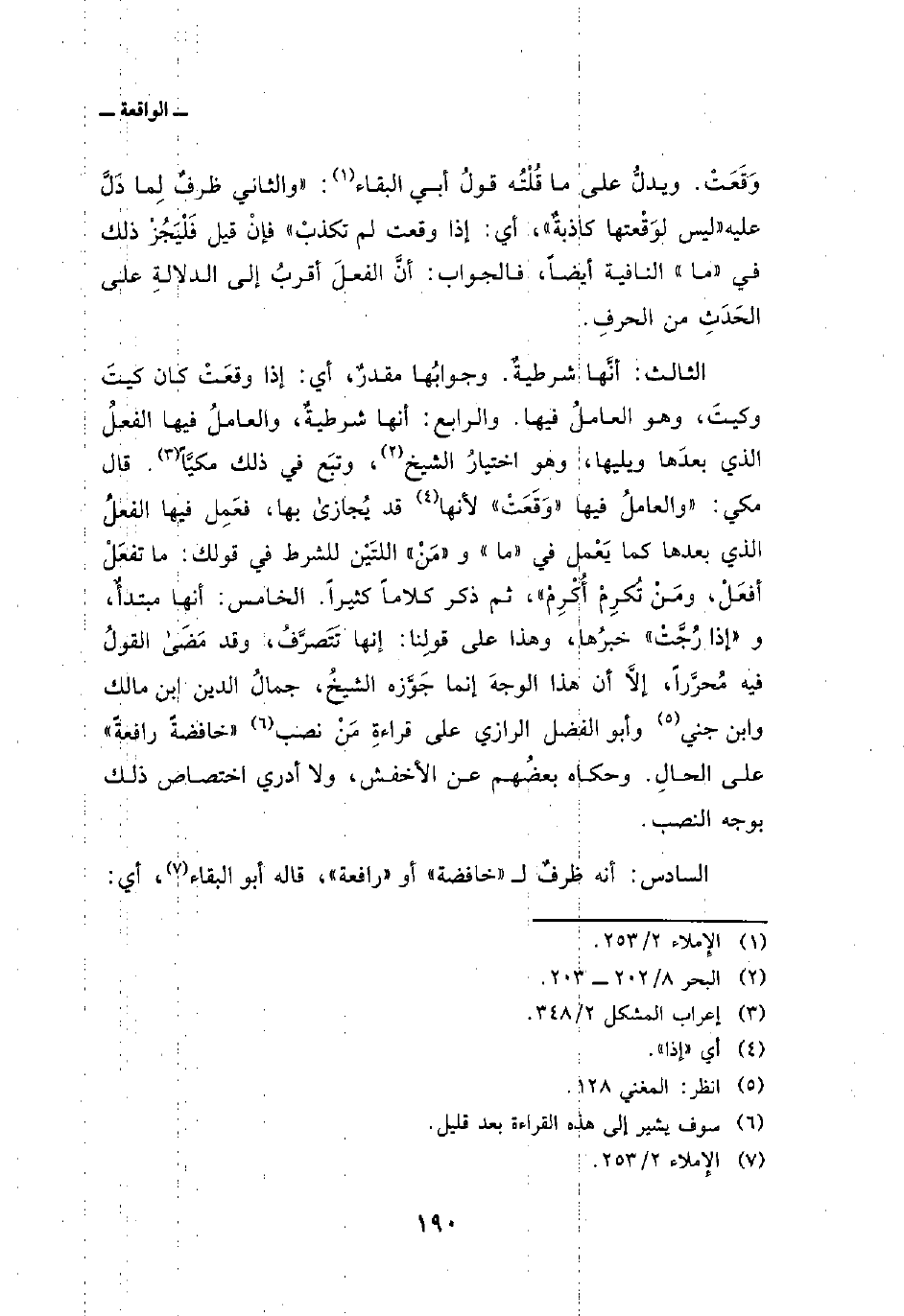 الثالث: أنَّها شرطيةٌ. وجوابُها مقدرٌ، أي: إذا وقعَتْ كان كيتَ وكيتَ، وهو العاملُ فيها. والرابع: أنها شرطيةٌ، والعاملُ فيها الفعلُ الذي بعدَها ويليها، وهو اختيارُ الشيخ، وتبَع في ذلك مكيَّاً. قال مكي:» والعاملُ فيها «وَقَعَتْ» لأنها قد يُجازى بها، فعَمِل فيها الفعلُ الذي بعدها كما يَعْمل في «ما» و «مَنْ» اللتَيْن للشرط في قولك: ما تفعَلُ أفعَلْ، ومَنْ تُكرِمْ أُكْرِمْ «، ثم ذكر كلاماً كثيراً. الخامس: أنها مبتدأٌ، و» إذا رُجَّتْ «خبرُها، وهذا على قولِنا: إنها تَتَصرَّفُ، وقد مَضَى القولُ فيه مُحرَّراً، إلاَّ أن هذا الوجهَ إنما جَوَّزه الشيخُ، جمالُ الدين ابن مالك وابن جني وأبو الفضل الرازي على قراءةِ مَنْ نصب» خافضةً رافعةً «على الحالِ. وحكاه بعضُهم عن الأخفش، ولا أدري اختصاص ذلك يوجه النصب.