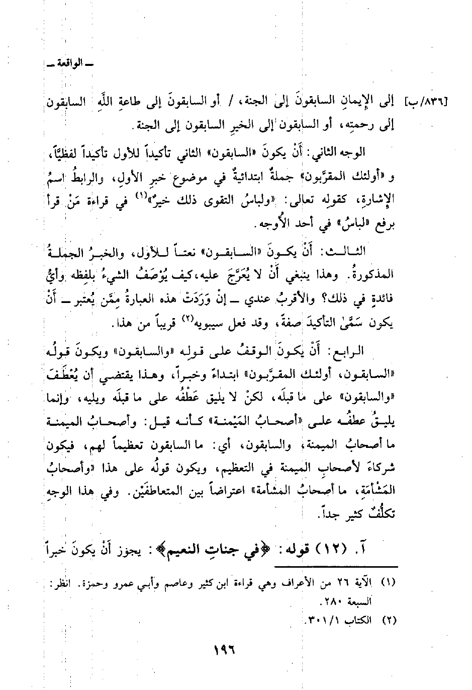 الرابع: أَنْ يكونَ الوقفُ على قولِه «والسابقون» ويكونَ قولُه «السابقون، أولئك المقرَّبون» ابتداءً وخبراً، وهذا يقتضي أن يُعْطَفَ «والسابقون» على ما قبلَه، لكنْ لا يليق عَطْفُه على ما قبلَه ويليه، وإنما يليقُ عطفُه على «أصحابُ المَيْمنة» كأنه قيل: وأصحابُ الميمنة ما أصحابُ الميمنة، والسابقون، أي: ما السابقون تعظيماً لهم، فيكون شركاءَ لأصحابِ الميمنة في التعظيم، ويكون قولُه على هذا «وأصحابُ المَشْأمَةِ، ما أصحابُ المشأمة» اعتراضاً بين المتعاطفَيْن. وفي هذا الوجهِ تكلُّفٌ كثير جداً.