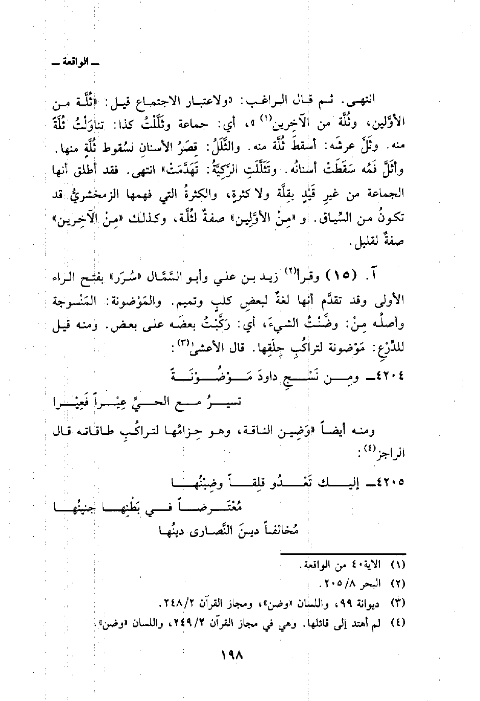 وقرأ زيد بن علي وأبو السَّمَّال «سُرَر» بفتح الراء الأولى وقد تقدَّم أنها لغةٌ لبعضِ كلبٍ وتميم. والمَوْضونة: المَنْسوجة وأصلُه مِنْ: وضَّنْتُ الشيءَ، أي: رَكَّبْتُ بعضَه على بعض. ومنه قيل للدِّرْعِ: مَوْضونة لتراكُبِ حِلَقِهِا. قال الأعشى: