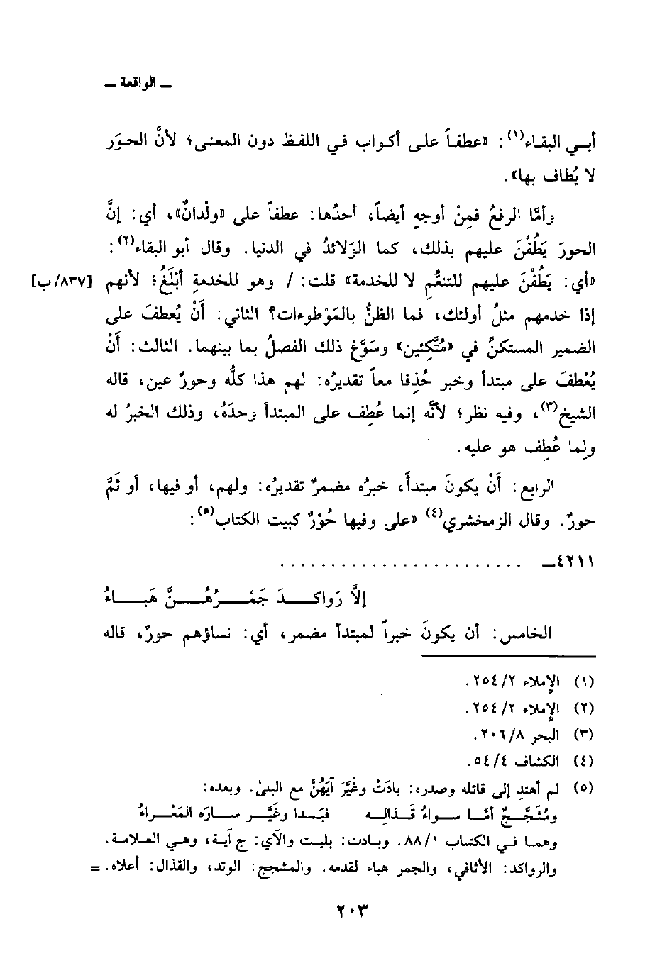 أبي البقاء: «عطفاً على أكواب في اللفظ دون المعنى؛ لأنَّ الحوَر لا يُطاف بها» .